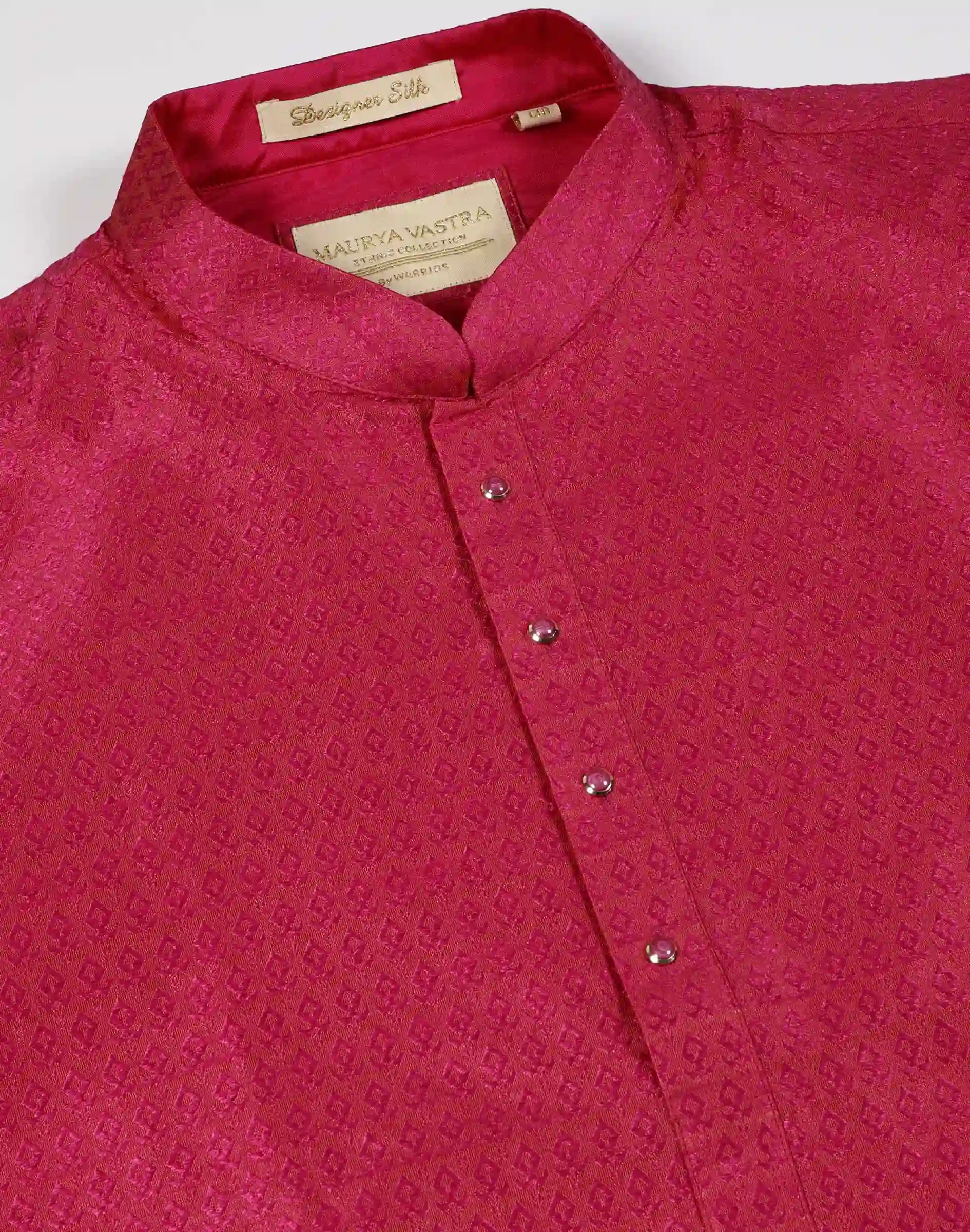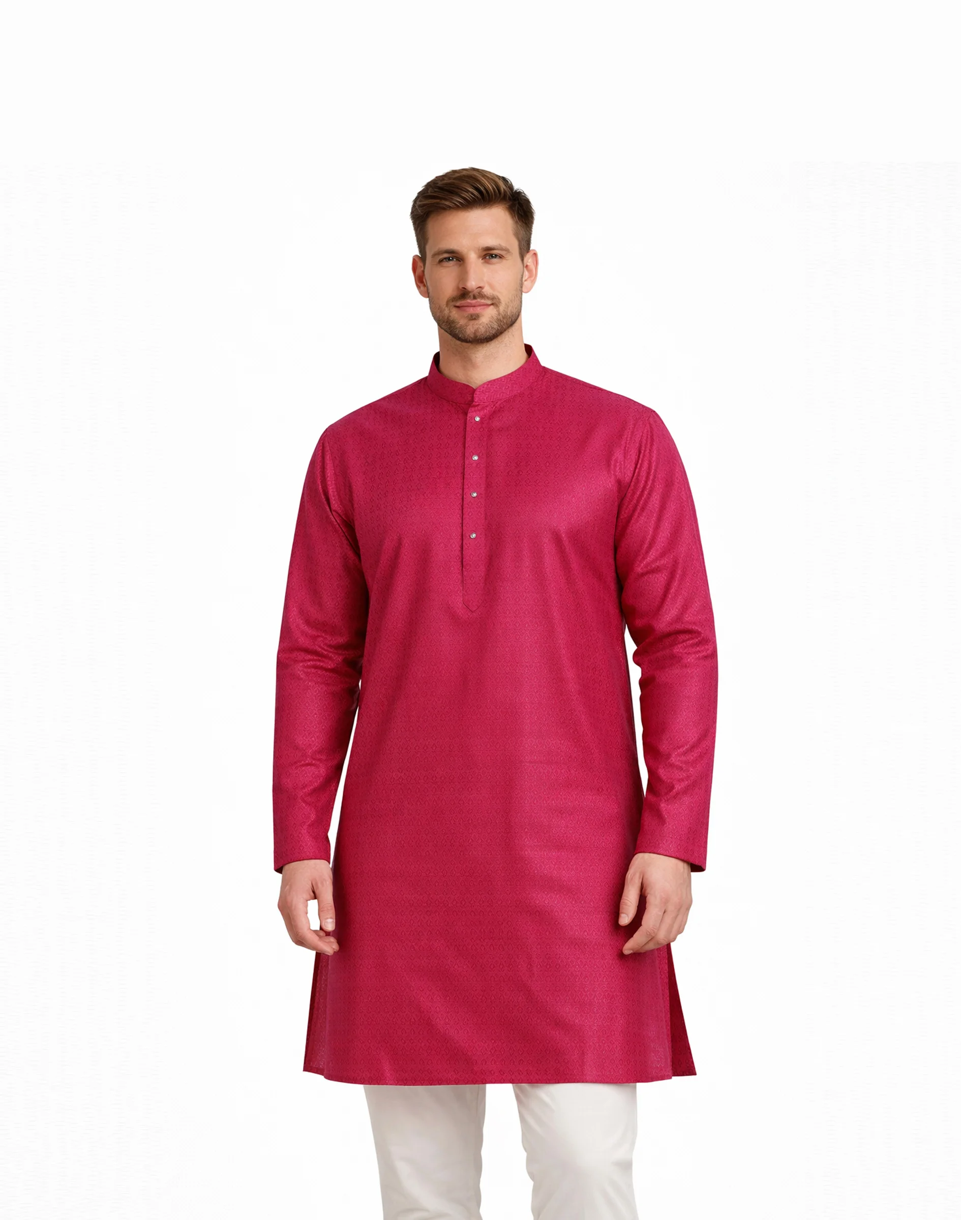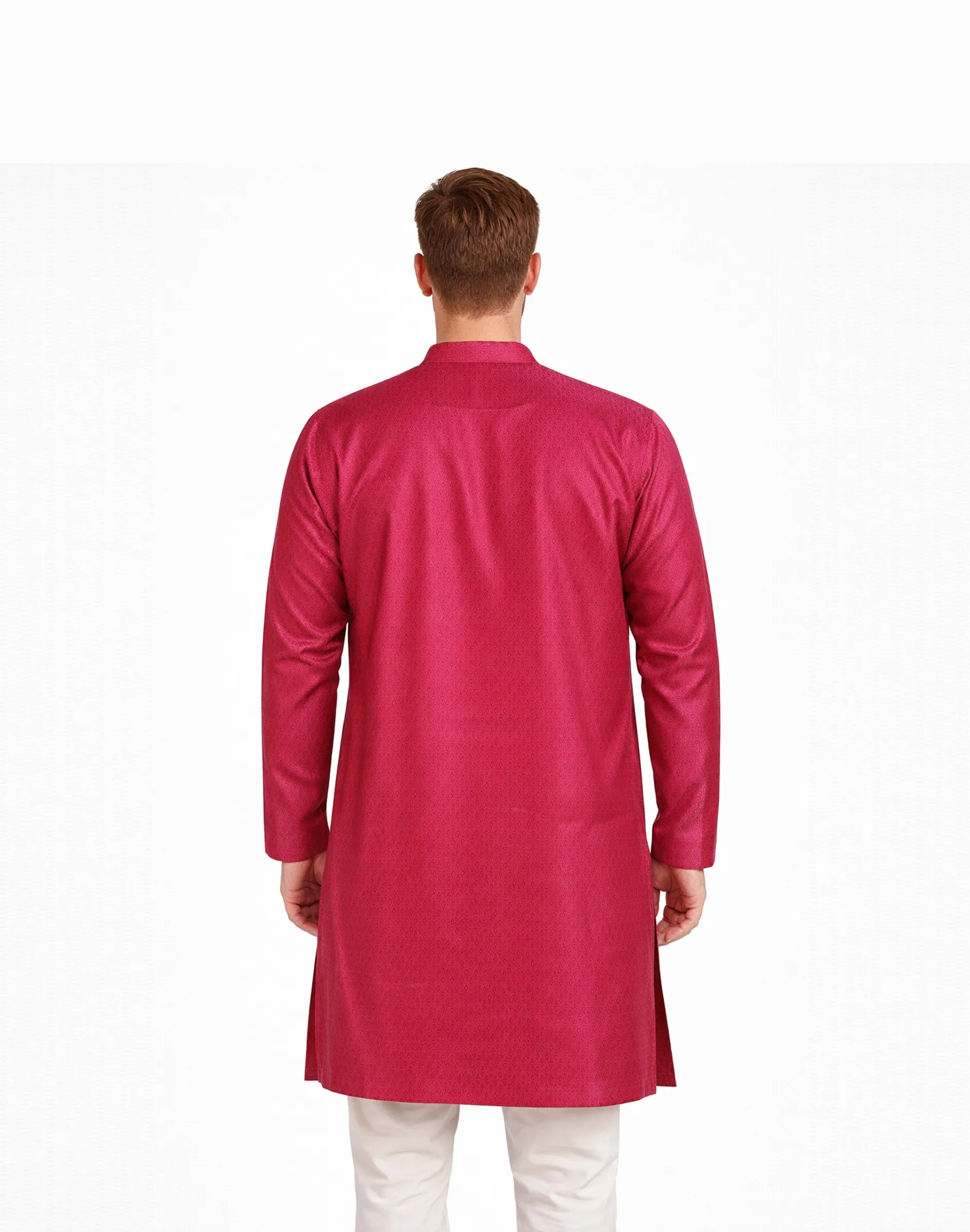 Make a bold yet refined impression with the Maurya Vastra Ruby Pink Textured Festive Kurta. Designed in a rich, eye-catching hue, this kurta features a delicate self-textured pattern that adds depth and sophistication without overpowering the look. The luxurious sheen of the fabric enhances its festive appeal, making it a standout choice for weddings, cultural celebrations, and special occasions. Tailored with a clean mandarin collar and a sleek button placket, the kurta blends contemporary styling with traditional elegance. The full sleeves and structured silhouette provide a sharp, flattering fit, while the breathable fabric ensures comfort throughout the day. Pair it with light-toned bottoms to let the vibrant color truly shine.