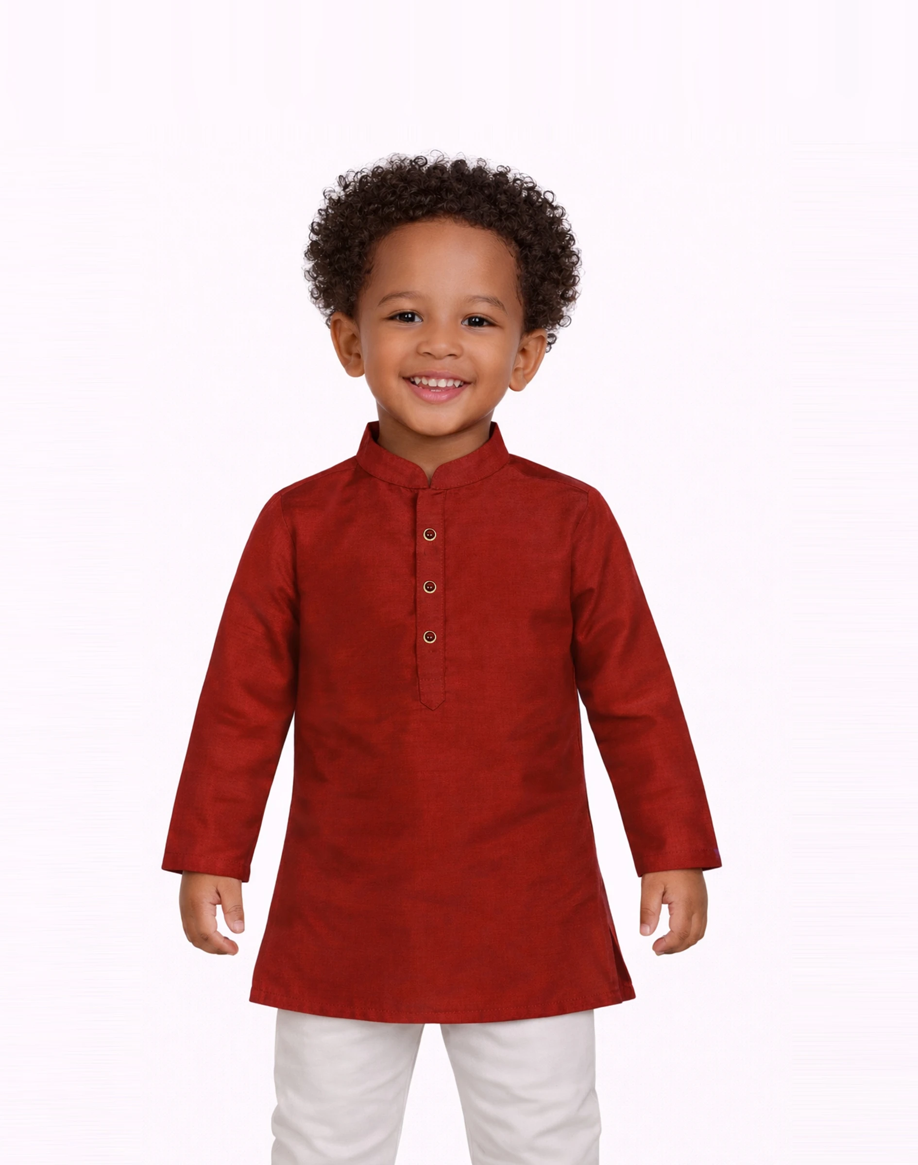 This classic boys’ kurta set in a rich rust red hue is designed for understated elegance. Featuring a clean, solid finish with a structured mandarin collar and a neat buttoned placket, it offers a refined traditional look. The simplicity of the design makes it highly versatile, while the soft, breathable fabric ensures comfort for all-day wear. Paired with light-colored bottoms, this kurta set is perfect for festive occasions, family gatherings, and cultural celebrations.