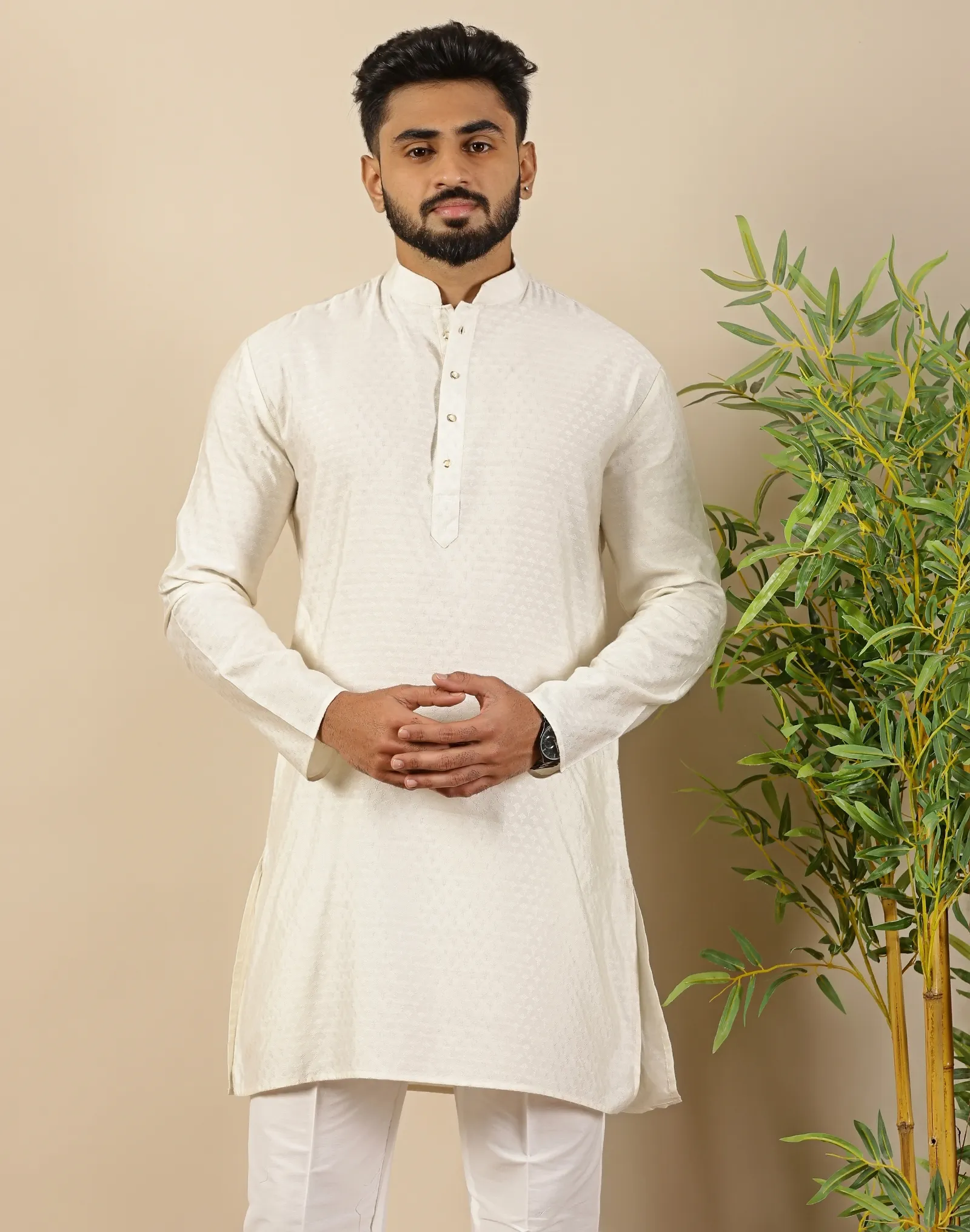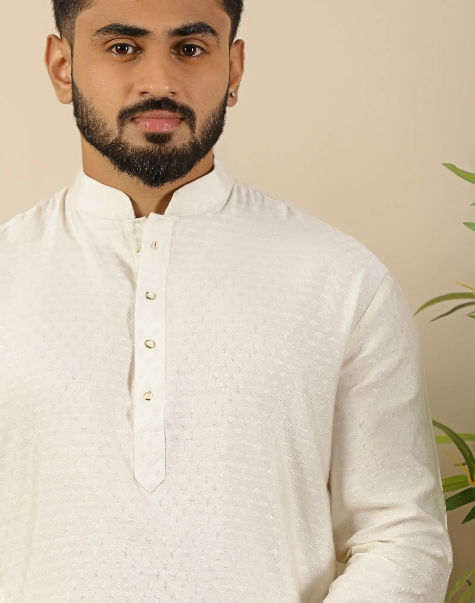 Featuring a delicately textured surface, the design adds depth while maintaining a clean, monochromatic aesthetic. A structured mandarin collar and streamlined button placket enhance its modern appeal, while full-length sleeves and a straight silhouette create a timeless, balanced look. Cut in a regular fit, the Maurya Vastra kurta allows easy movement without compromising on sophistication.
