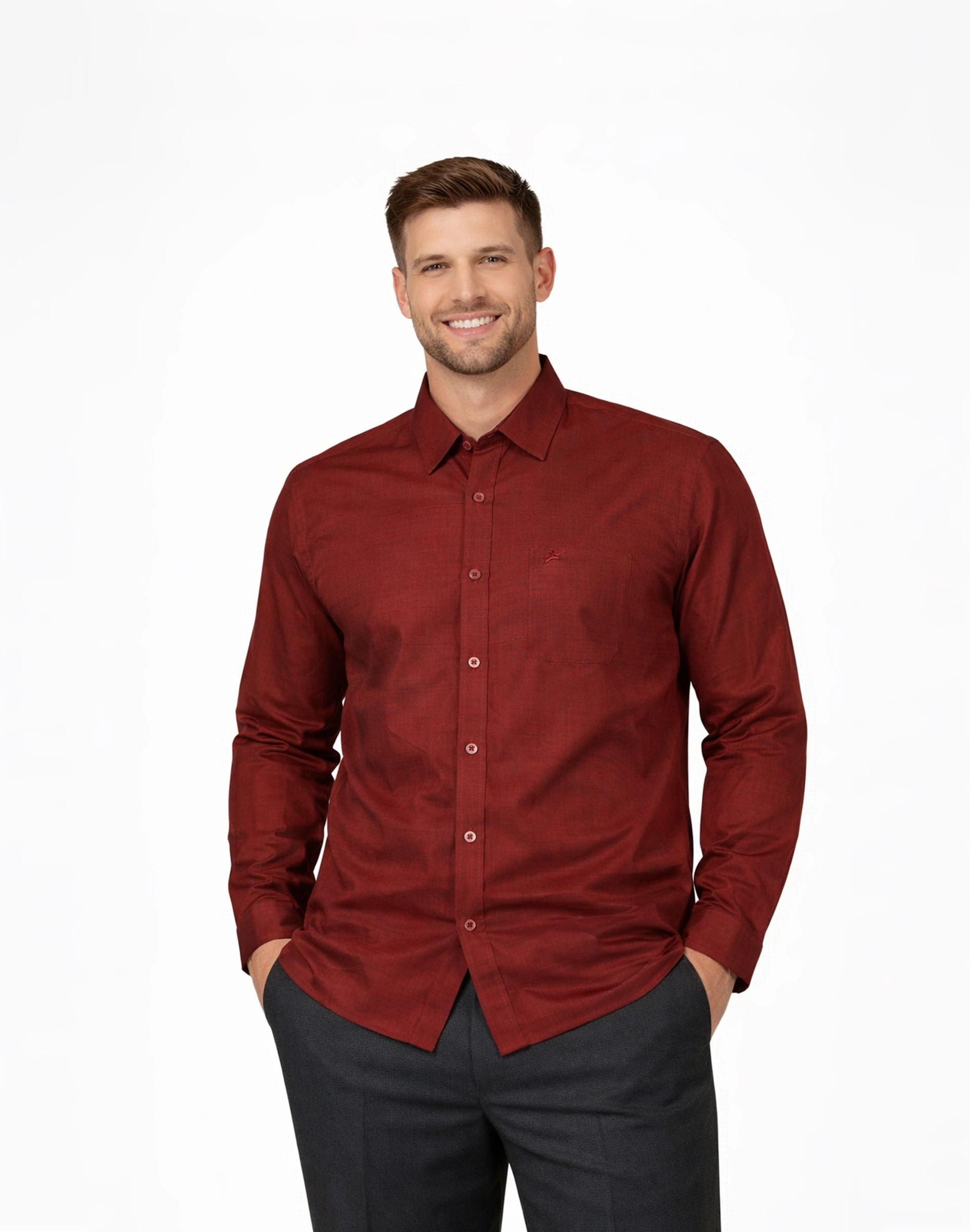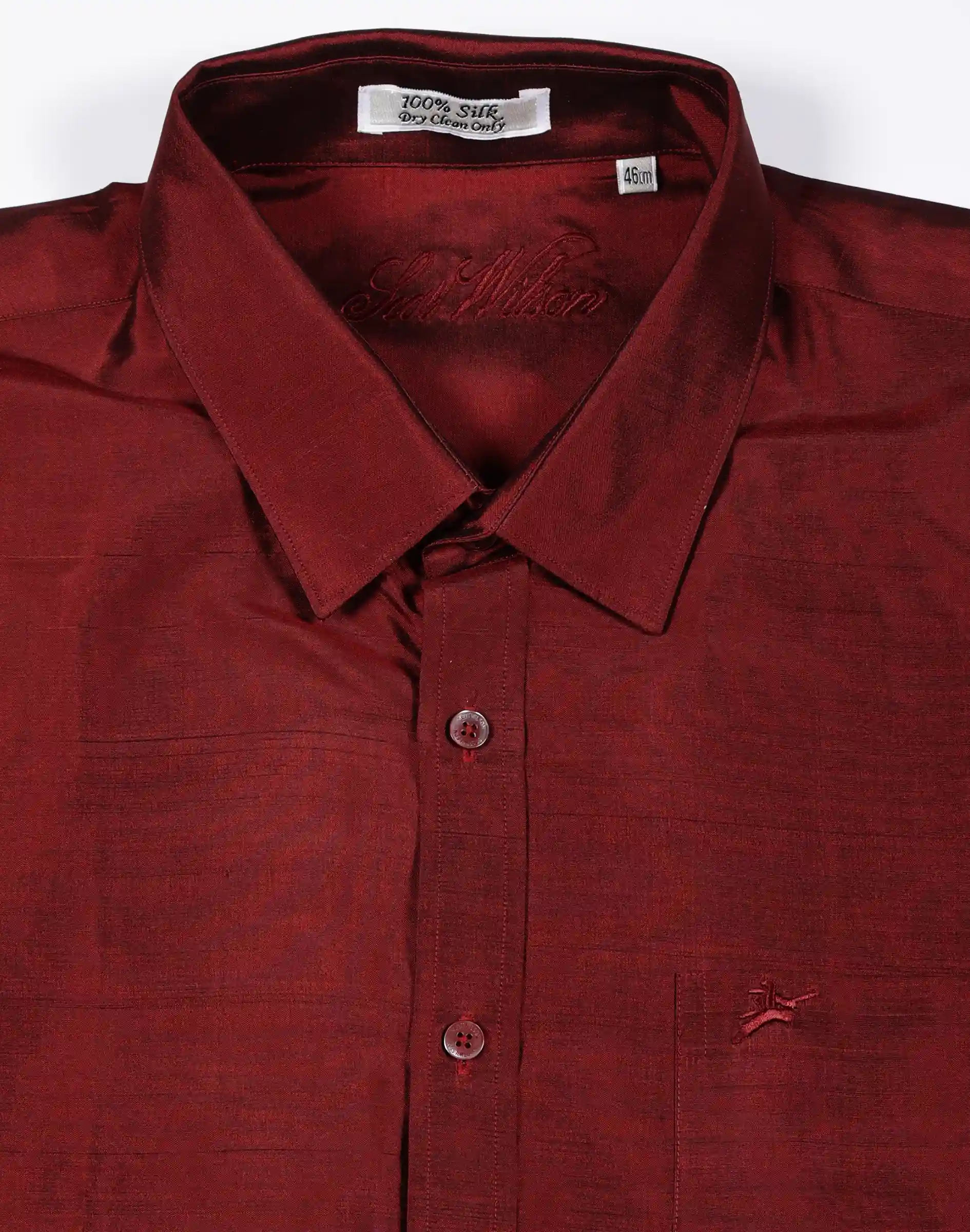 Make a refined impression with the Scotwilson Wine Red Premium Silk Shirt, designed for those who appreciate understated luxury. Crafted from 100% pure silk, this shirt features a smooth, lustrous texture that enhances its rich wine red hue. The deep tone adds elegance and depth, making it an ideal choice for evening occasions, celebrations, and formal gatherings. Tailored with a classic collar, full sleeves, and a clean silhouette, this shirt ensures both comfort and a sharp appearance. Subtle detailing, including a neatly finished placket and minimal branding, allows the richness of the fabric and color to take center stage. Whether styled for festive wear or formal evenings, this piece delivers effortless sophistication.