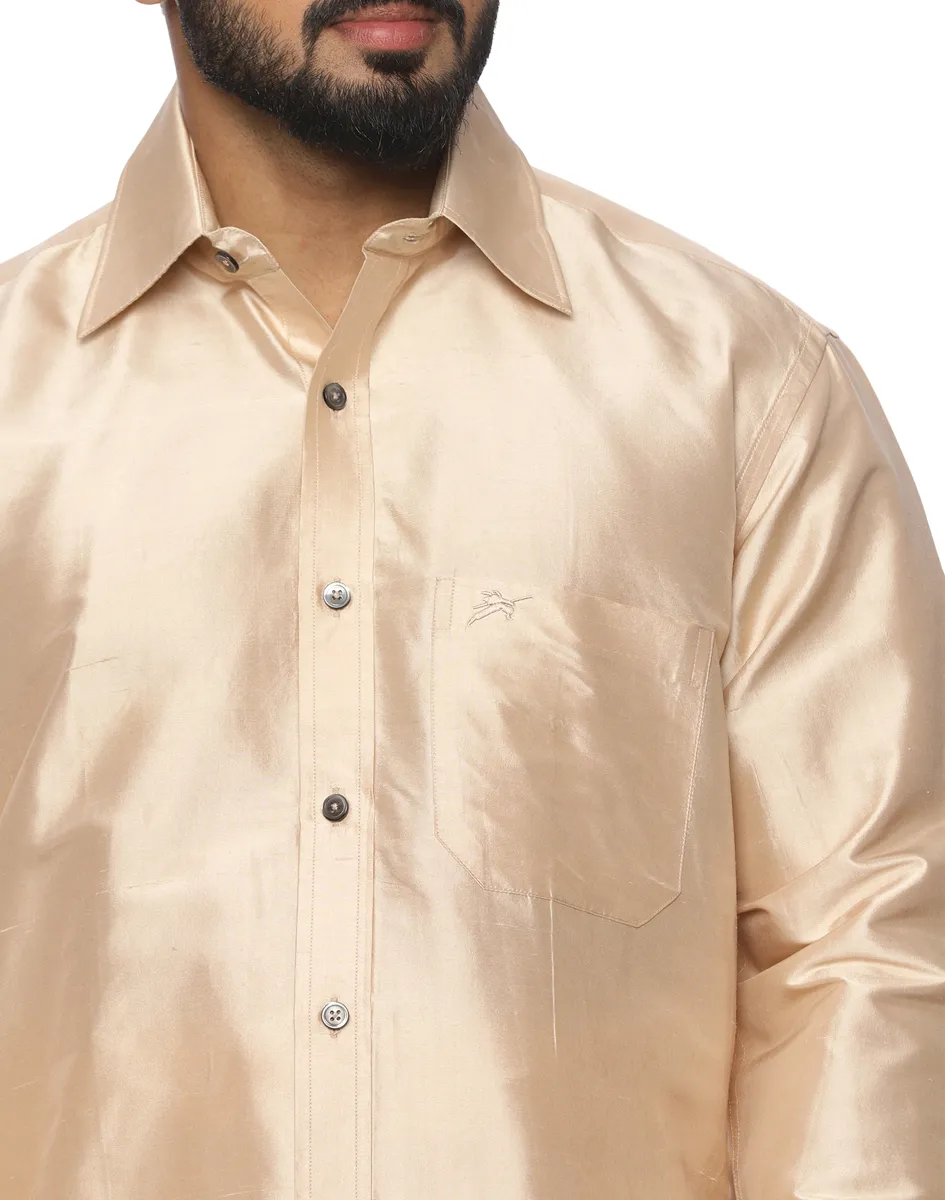 The Scot Wilson Ivory-Gold Silk-Blend Tailored Full Sleeve Shirt is made from premium silk-blend fabric with a smooth texture and subtle natural sheen. Lightweight, breathable, and gentle on the skin, it provides all-day comfort while maintaining a rich, polished appearance. Designed by Scot Wilson, this shirt perfectly combines traditional elegance with modern refinement.