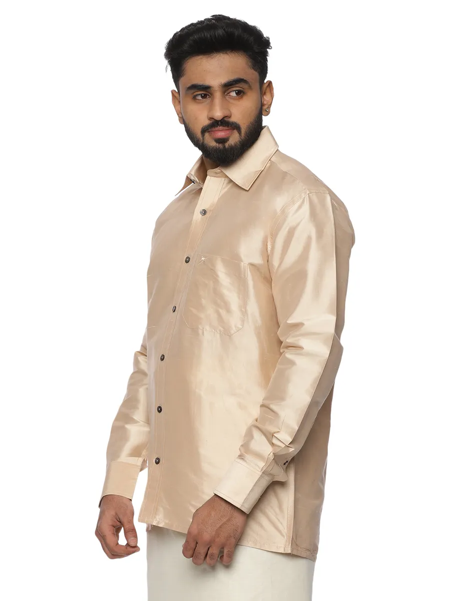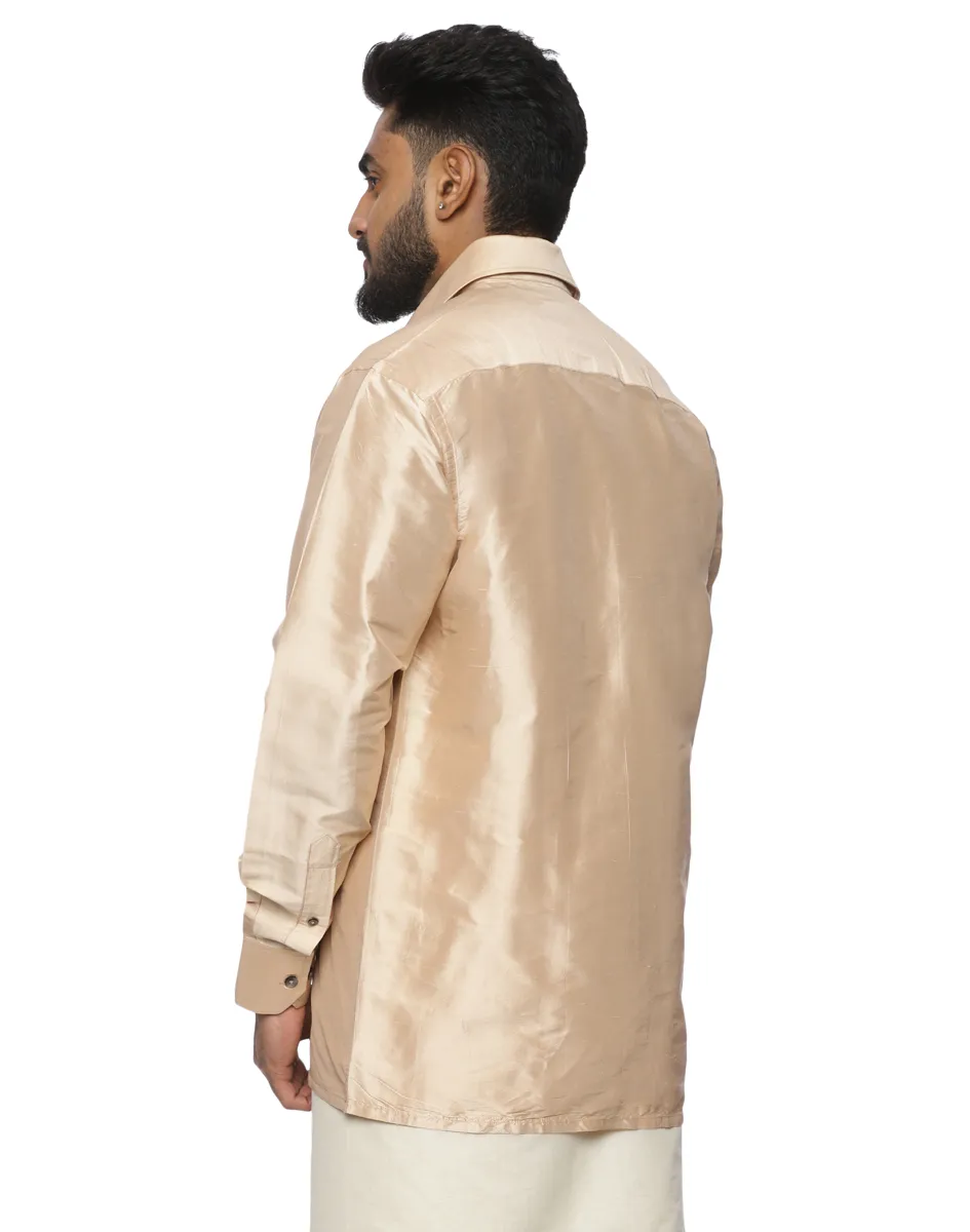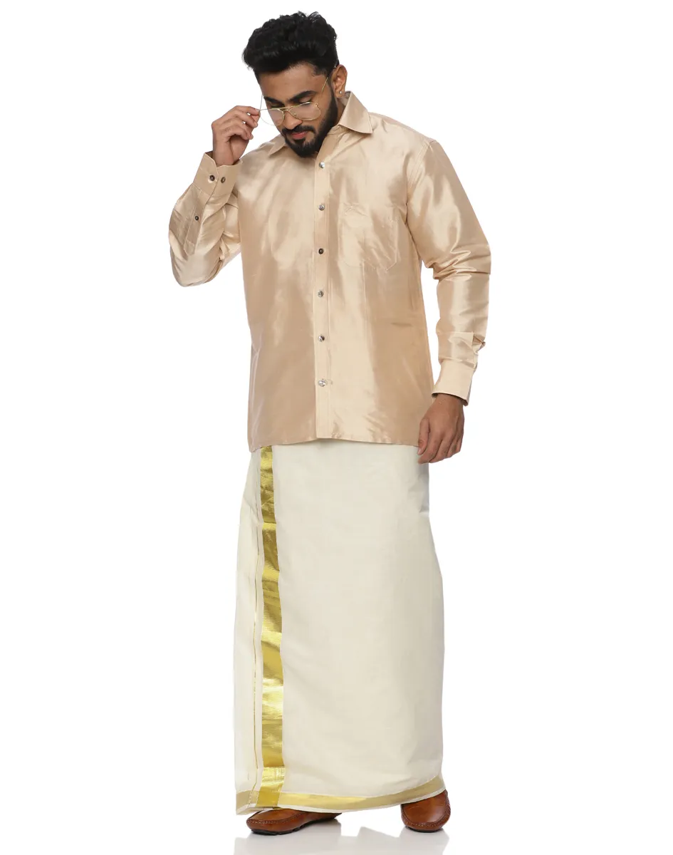 Style the Scot Wilson Ivory-Gold Silk-Blend Shirt traditionally with a white or off-white mundu for weddings, temple visits, and festive occasions. For a contemporary ethnic look, pair it with tailored beige trousers and polished leather footwear, keeping accessories minimal to maintain its timeless appeal.