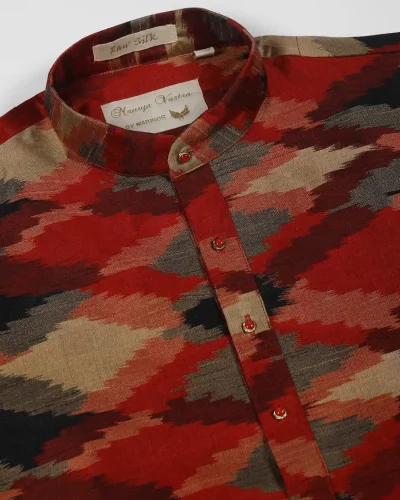 Maurya Vastra Red Multicolor Ikat Pattern Raw Silk Kurta