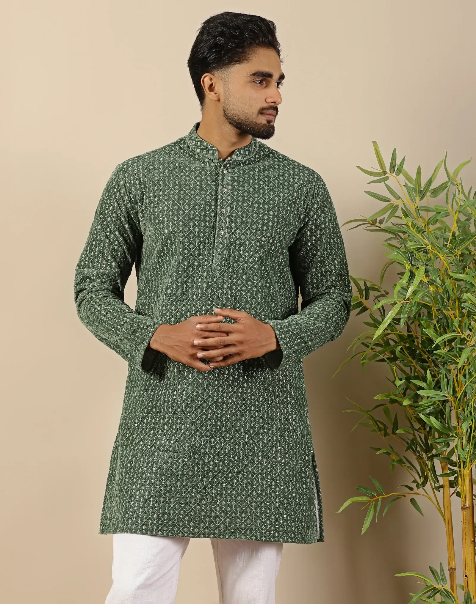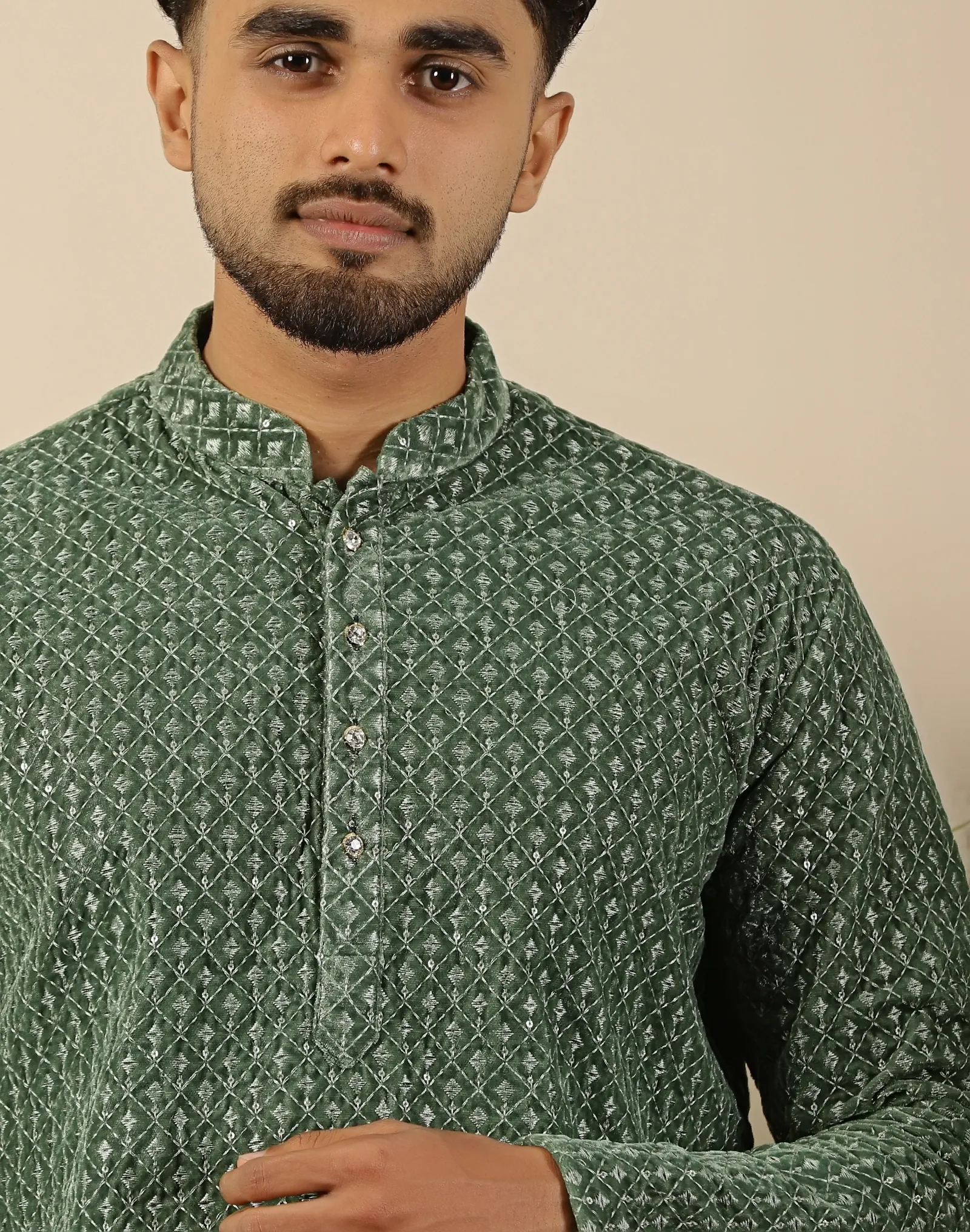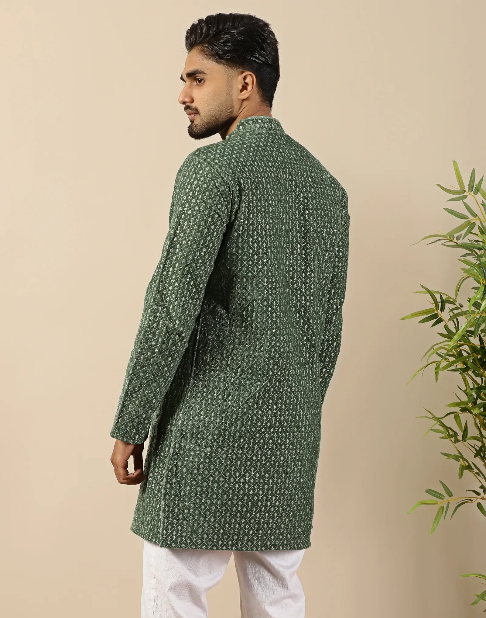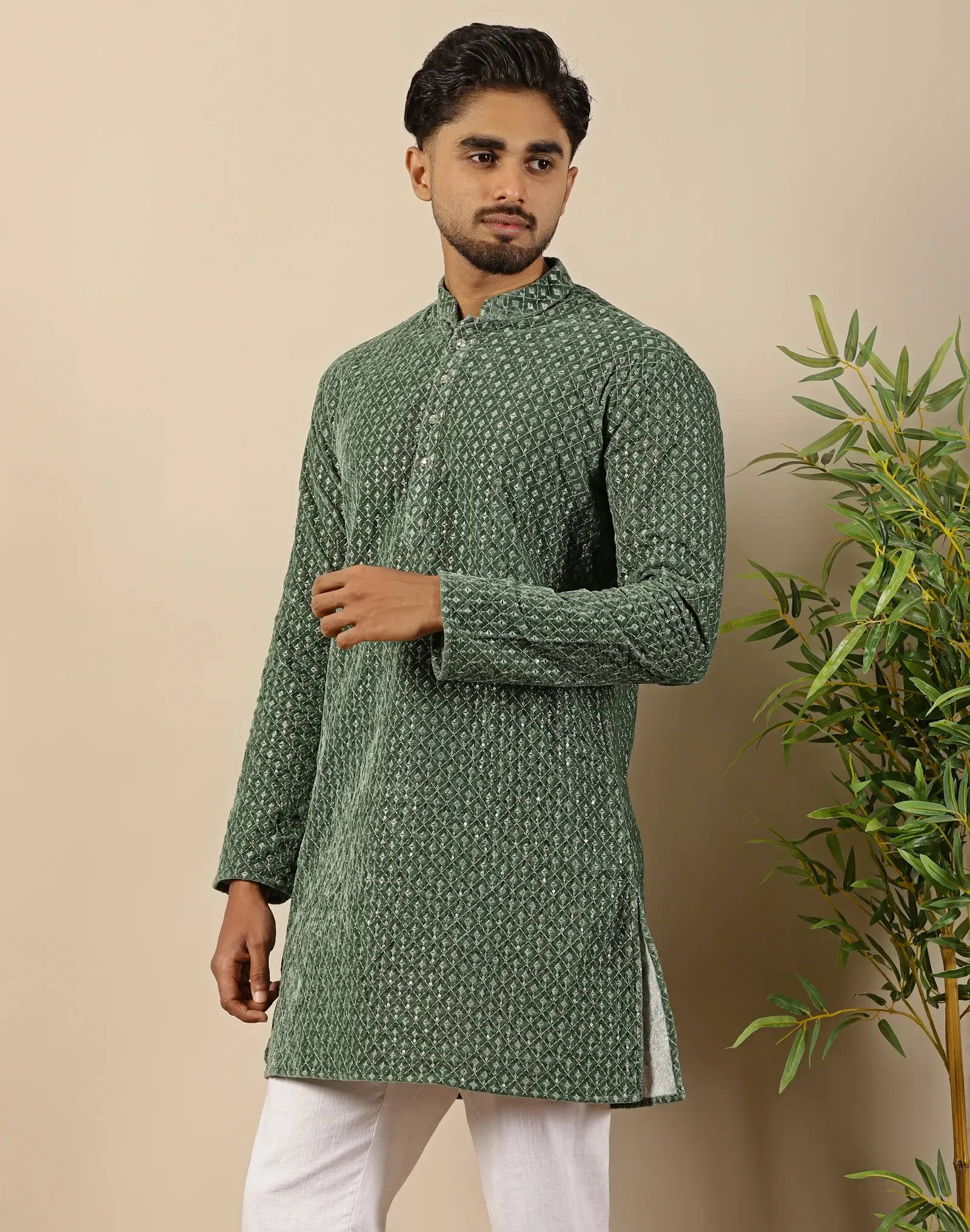 The kurta features an all-over geometric print that adds depth without overwhelming the design. A clean mandarin collar with a concealed placket enhances its contemporary appeal, while full-length sleeves and a straight hem ensure timeless versatility. The tailored regular fit allows ease of movement, making it suitable for both formal gatherings and refined casual wear.