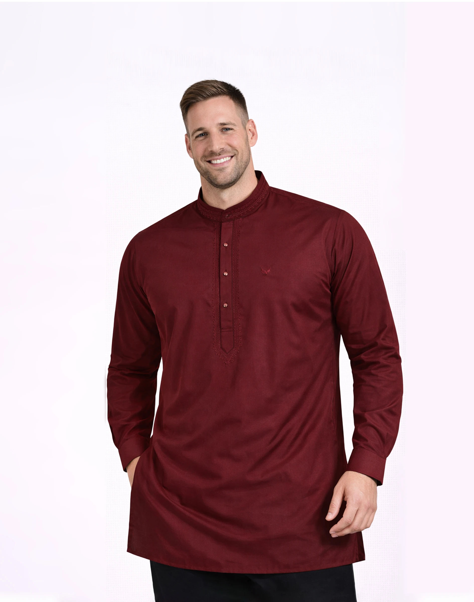 A rich deep maroon kurta with subtle embroidery detailing, crafted in premium cotton for a refined and modern ethnic look.