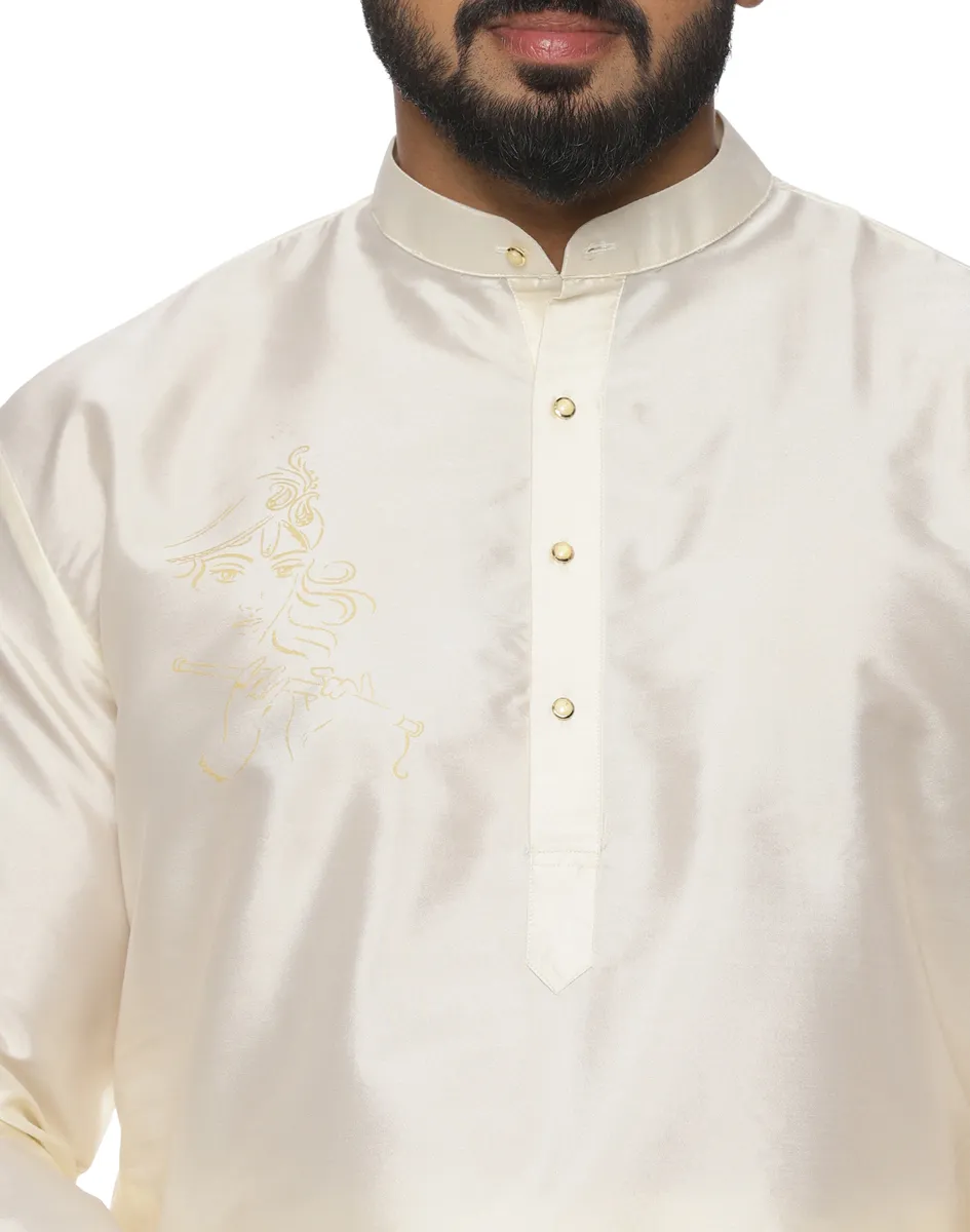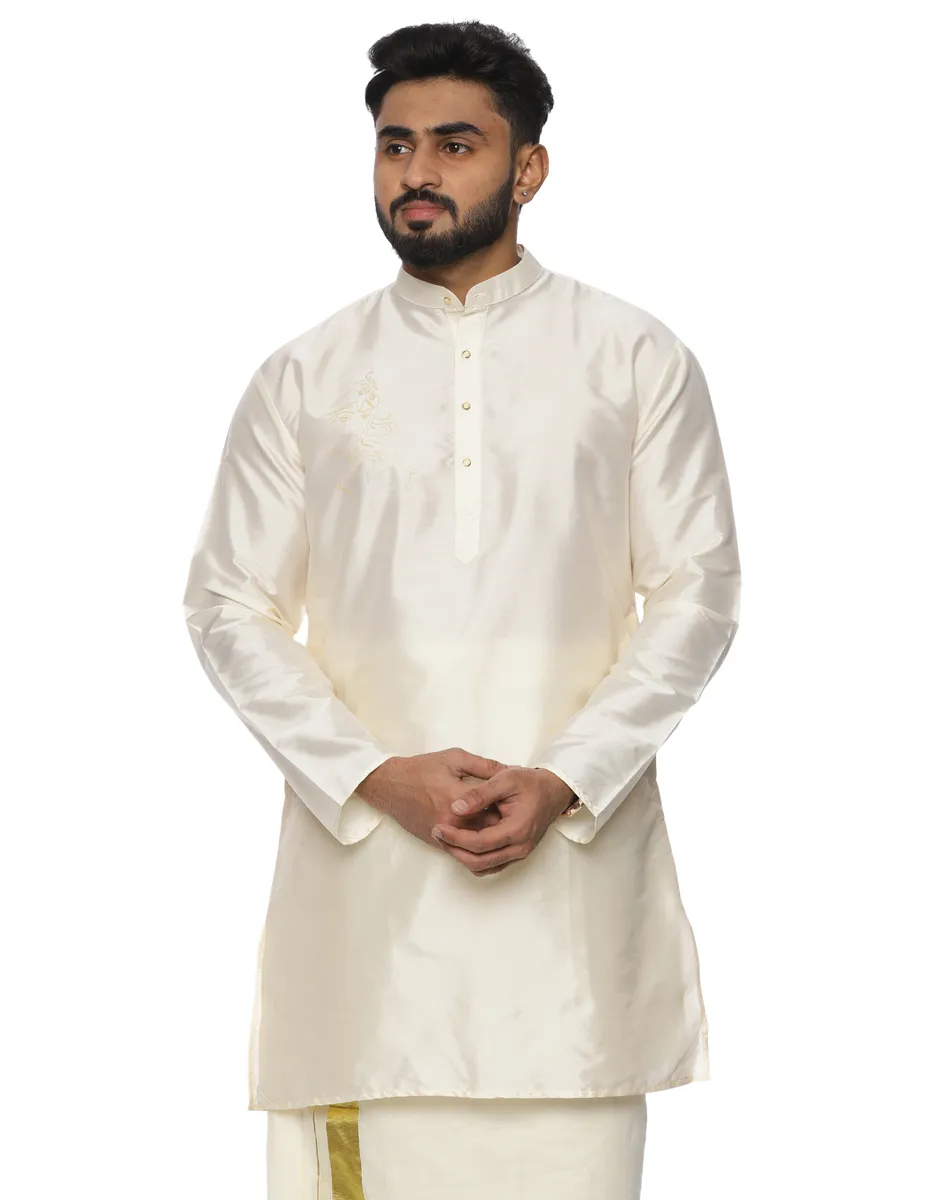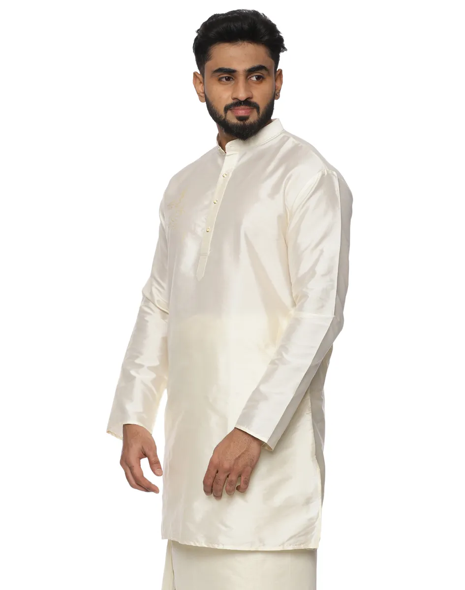 The Warrior Ivory Heritage Silk Kurta from House of Cocoon embodies classic Indian elegance with a contemporary sensibility. Crafted from premium silk-blend fabric, it features a subtle natural sheen that enhances its refined appeal while offering a smooth, luxurious feel against the skin.