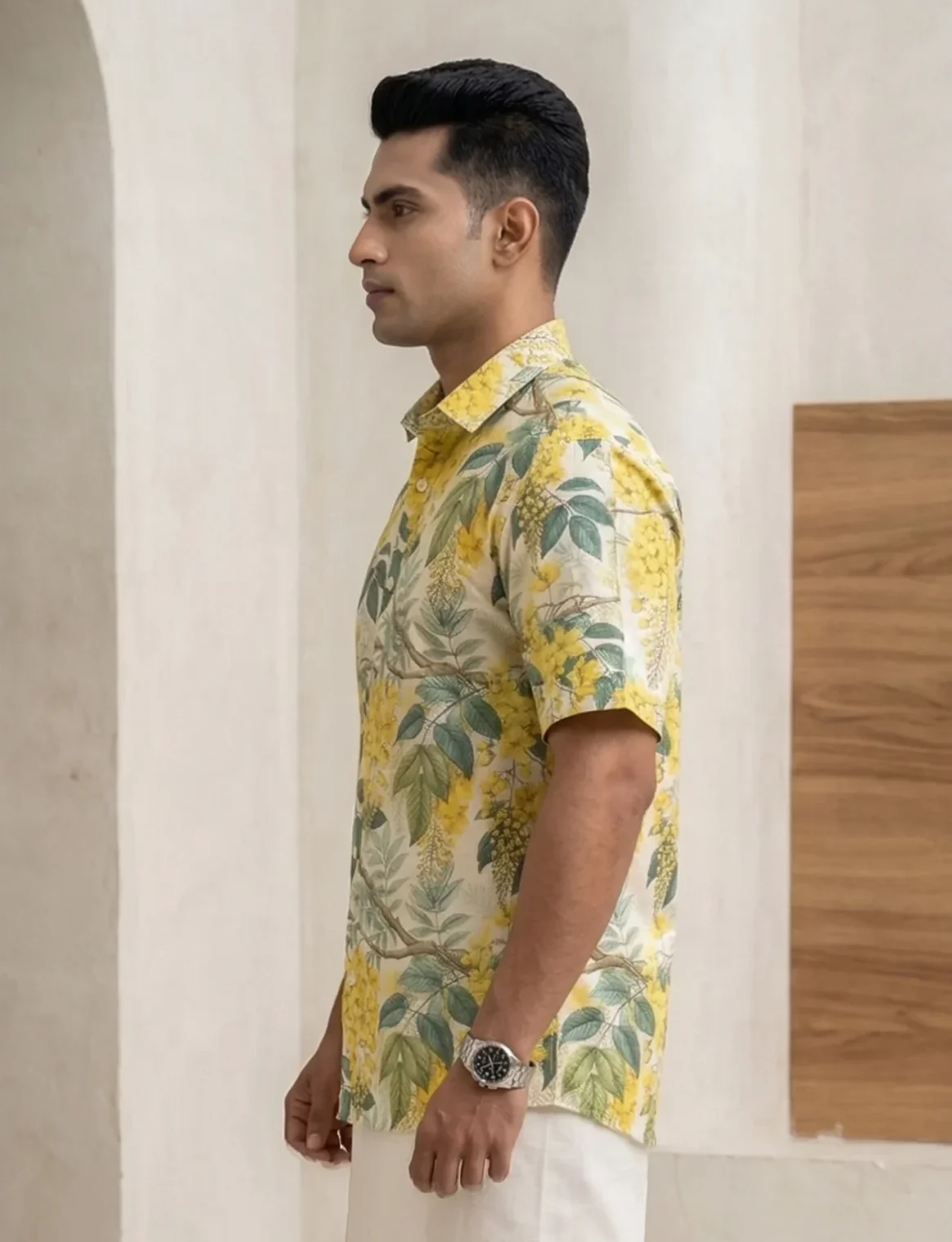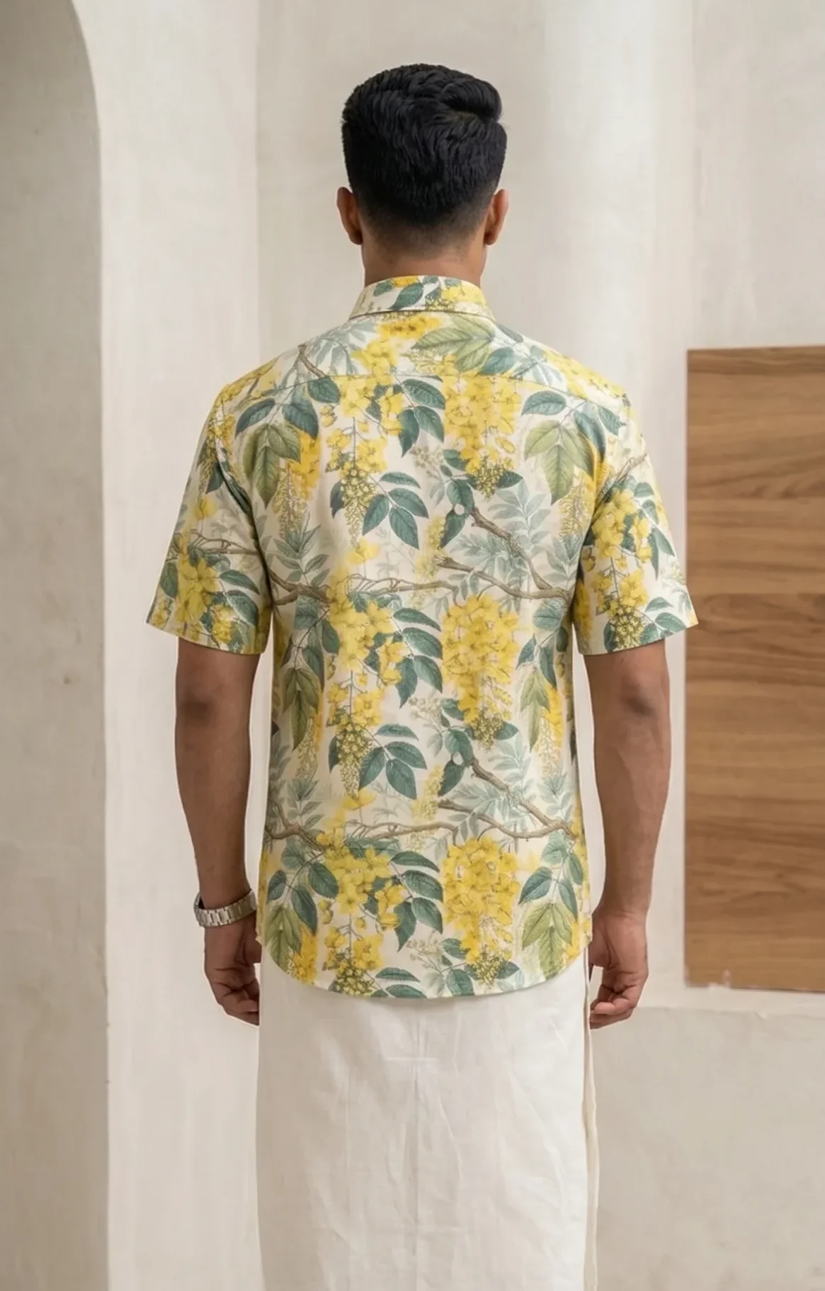 A vibrant Kanikonna printed half sleeve shirt, perfect for celebrating Vishu with tradition and style.