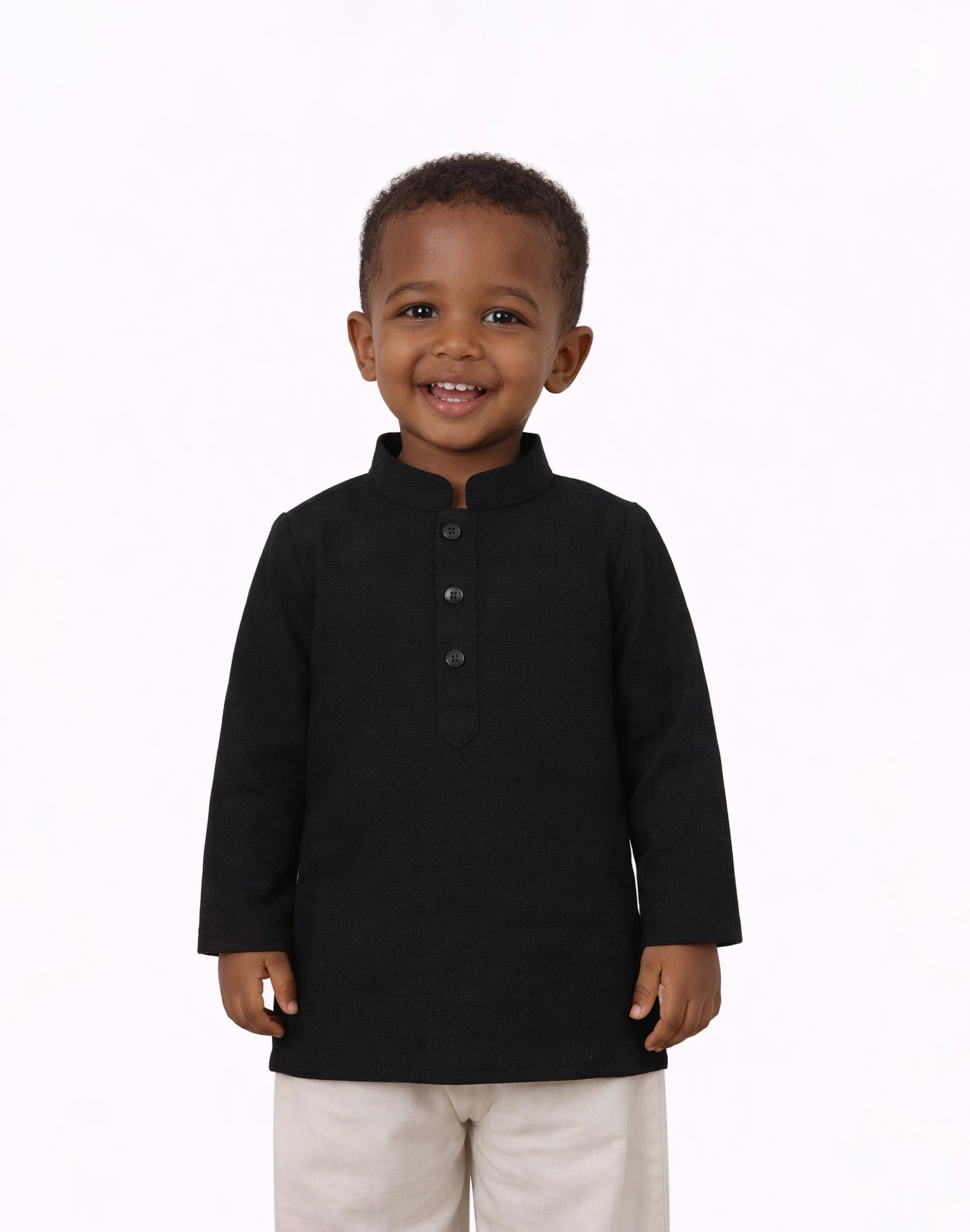 Elevate your child’s ethnic wardrobe with the Warrior Kid’s Black Textured Cotton Mandarin Collar Kurta. Designed in a timeless black shade, this kurta features a subtle textured weave that adds depth and a premium finish to the overall look. Crafted from high-quality breathable cotton, it ensures all-day comfort while maintaining a refined silhouette. The mandarin collar and buttoned placket lend a modern touch to this traditional piece, making it ideal for festive occasions, family functions, and special gatherings. Its versatile color allows effortless pairing with a variety of bottoms, making it a must-have staple for both ethnic and semi-formal styling.