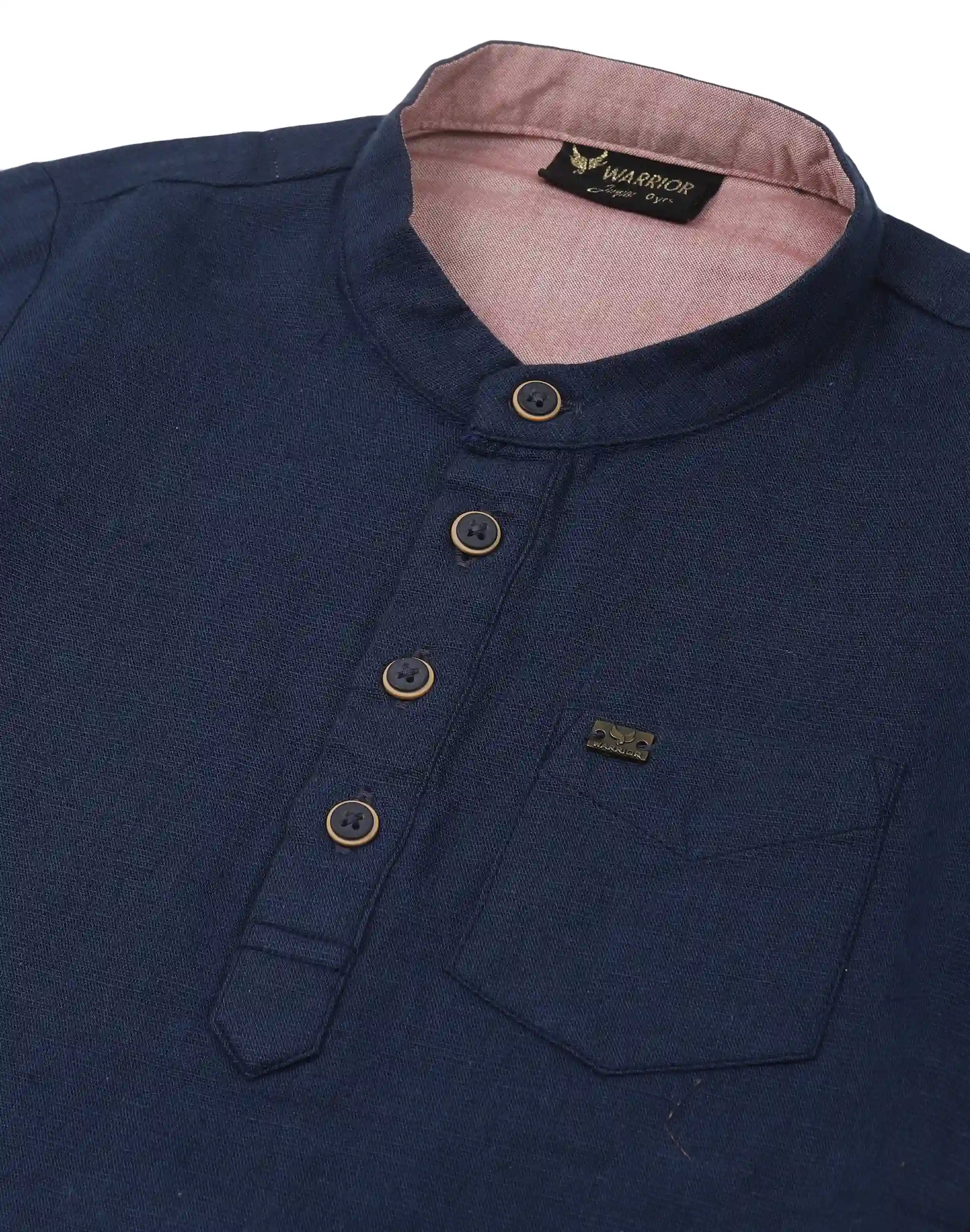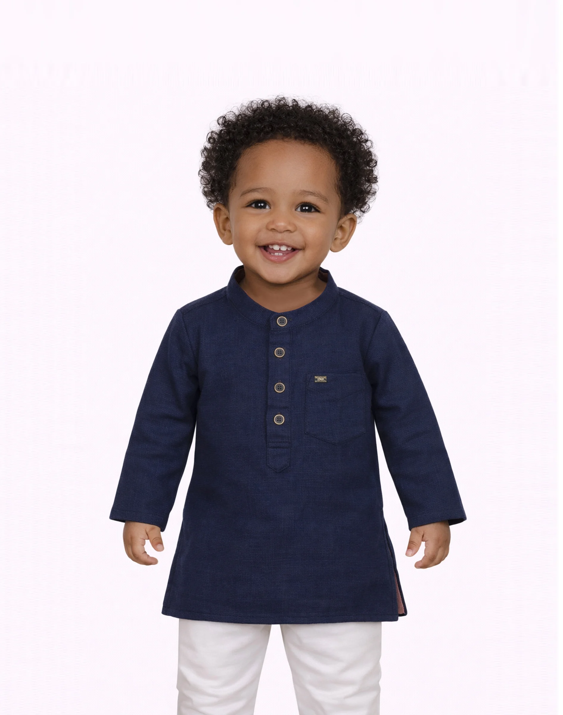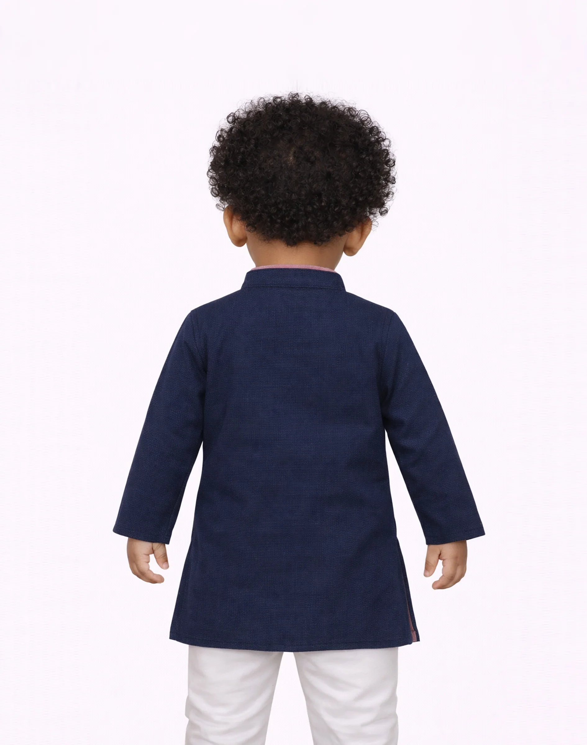Elevate your child’s ethnic wardrobe with the Maurya Vastra Kid’s Navy Blue Cotton Mandarin Collar Kurta. Crafted in a rich navy blue shade, this kurta offers a perfect blend of tradition and modern minimalism.Made from premium breathable cotton, it ensures all-day comfort while maintaining a refined look. The mandarin collar and buttoned placket add a contemporary touch, while the subtle texture of the fabric enhances its premium appeal. A neatly designed chest pocket with a metallic accent gives it a stylish edge.Whether it’s festive occasions, family gatherings, or casual outings, this kurta is a versatile staple that delivers both comfort and sophistication.