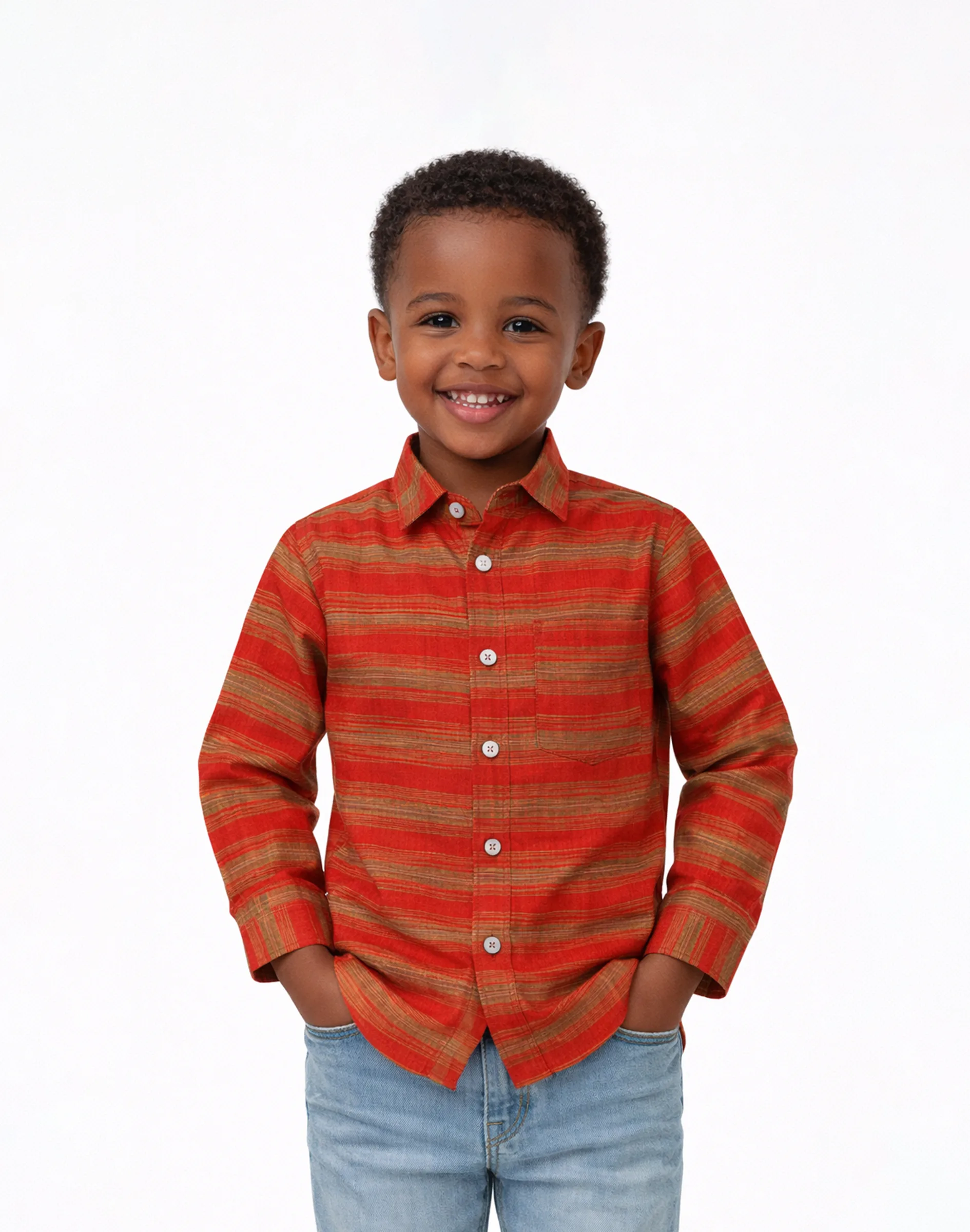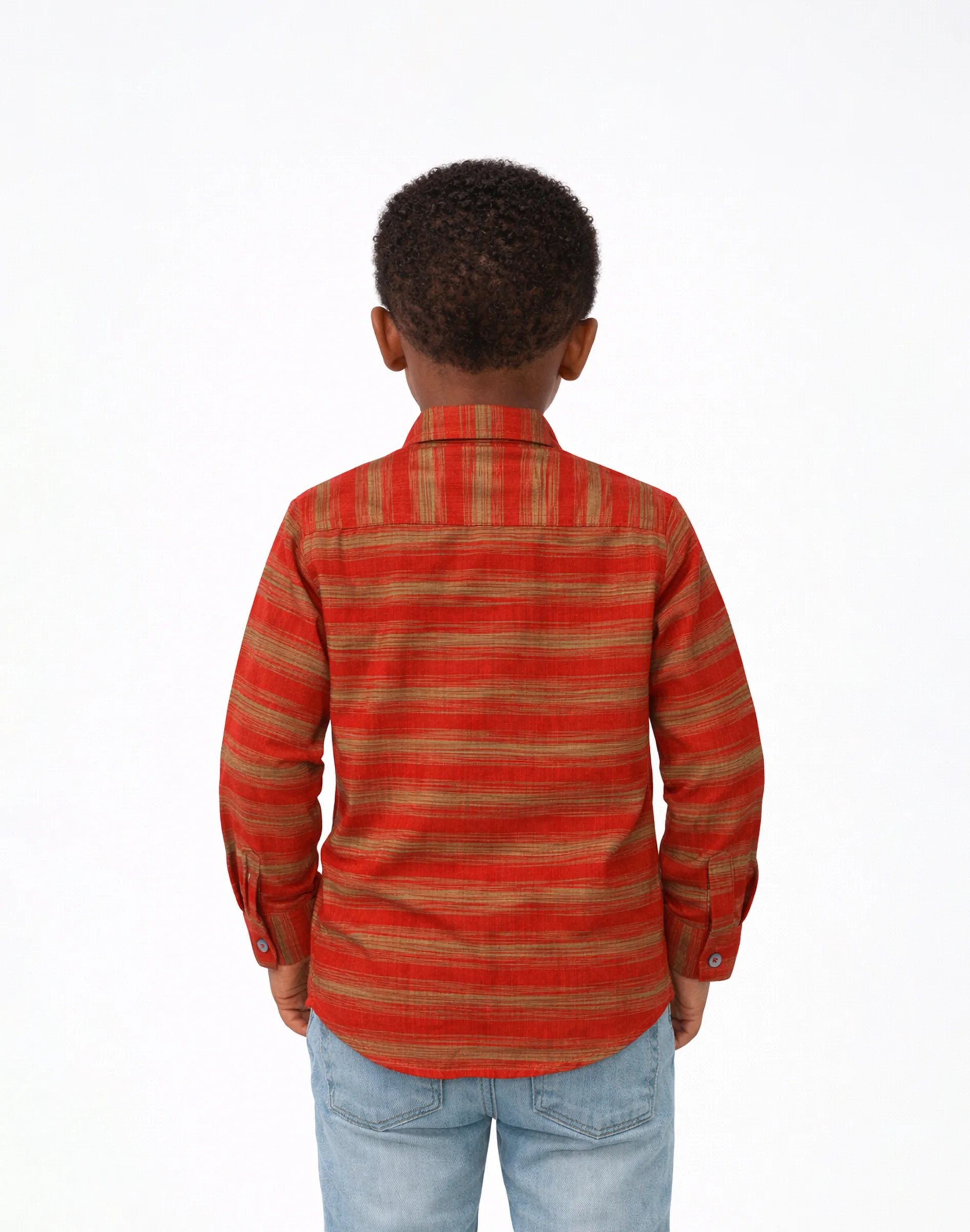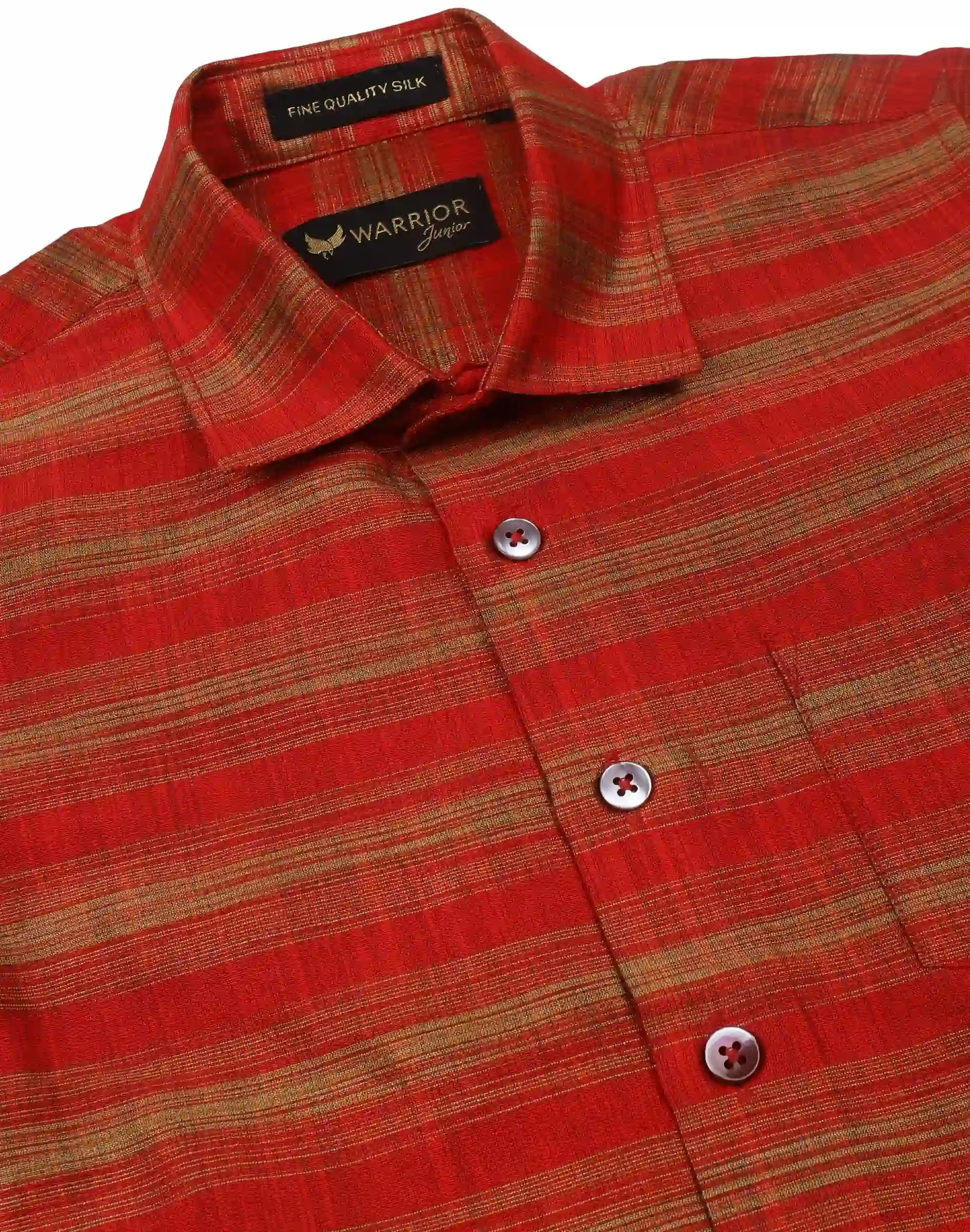 Add a touch of sophistication to your child’s wardrobe with the Warrior Kid’s Red Striped Full Sleeve Ethnic Silk Shirt. Featuring a vibrant red base with subtle golden-toned stripes, this shirt exudes a festive and refined appeal. Crafted from a fine-quality silk blend fabric, it offers a smooth texture with a gentle sheen, ensuring both comfort and a premium look. The classic collar, full button-down front, and neatly tailored chest pocket enhance its polished silhouette. Perfect for celebrations, weddings, and special occasions, this shirt effortlessly combines traditional richness with modern styling, making it a versatile festive essential.