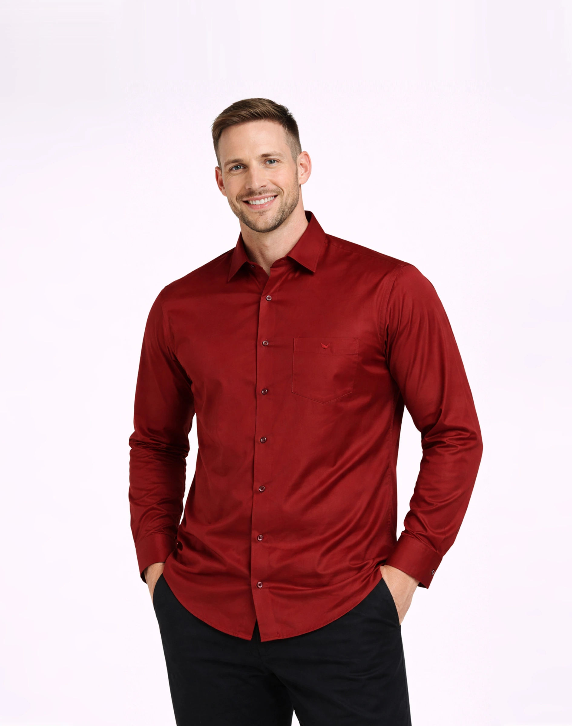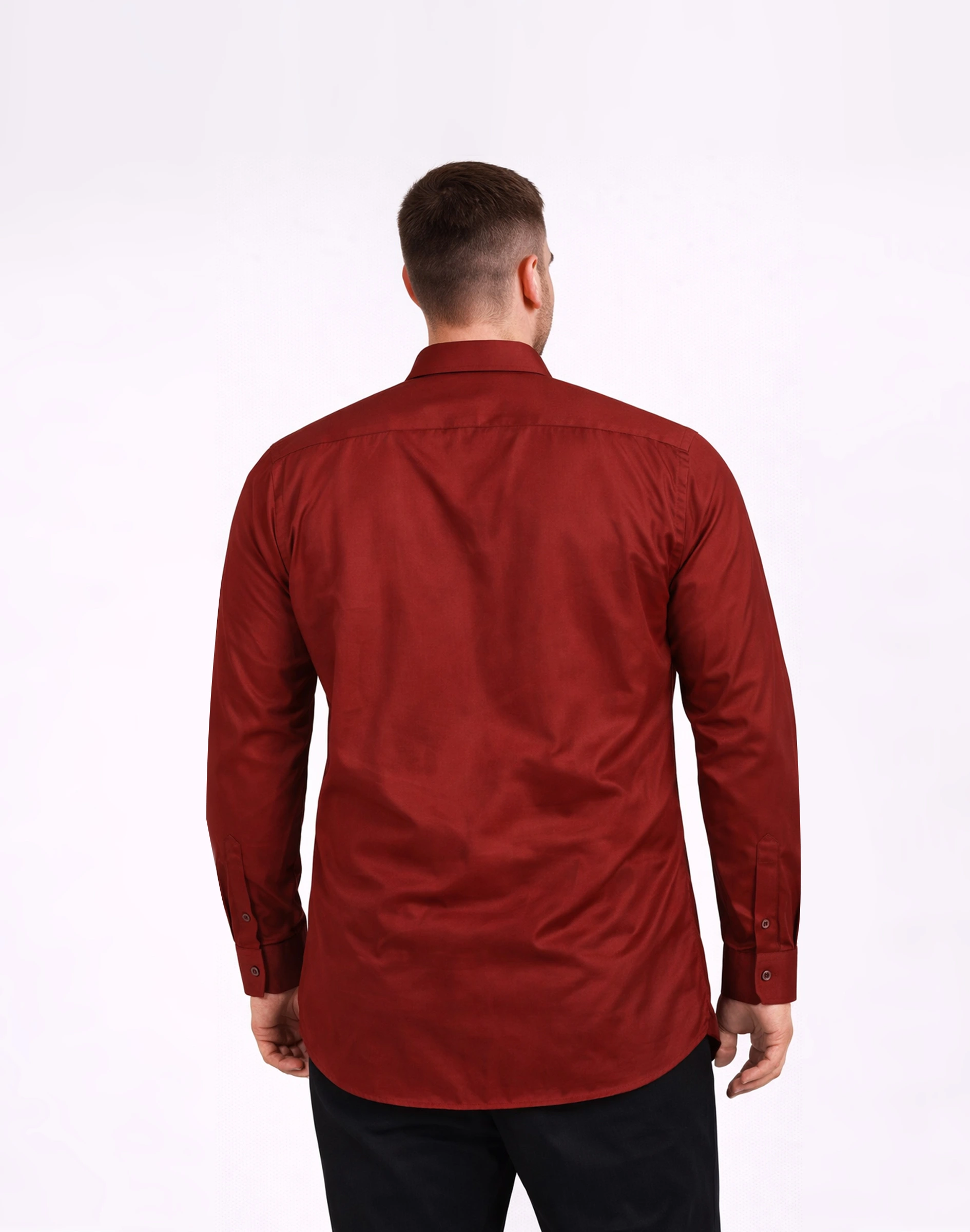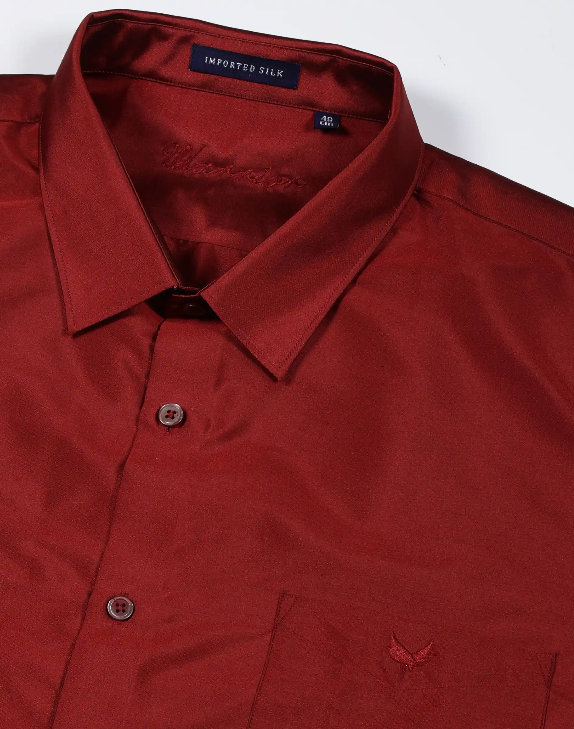 A sophisticated maroon formal shirt crafted from premium silk-finish fabric, offering a rich appearance with a smooth, lustrous texture.
