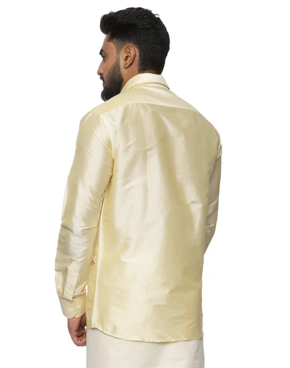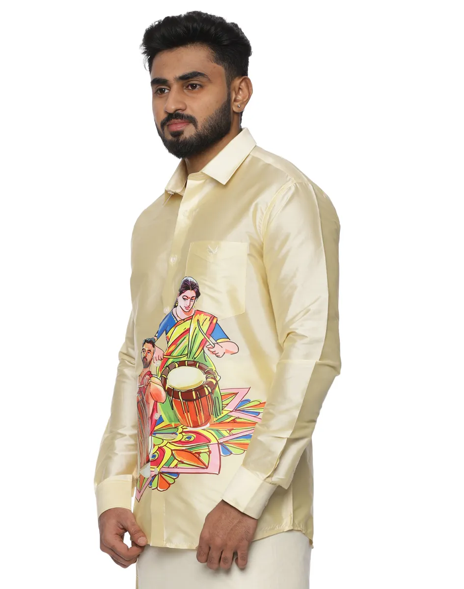 Rendered in an elegant ivory-gold base with a soft lustrous finish, the shirt features an artistic print inspired by traditional percussion and festive rhythm. A classic collar with a refined button-down front, full sleeves with neatly finished cuffs, and a minimal chest pocket integrated seamlessly into the design enhance its polished, premium appeal.