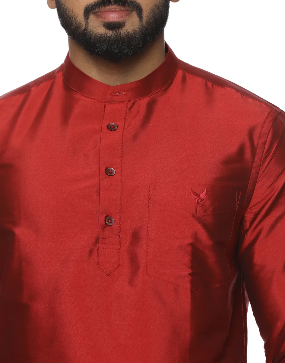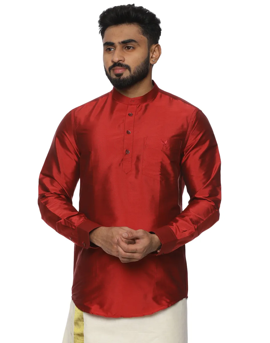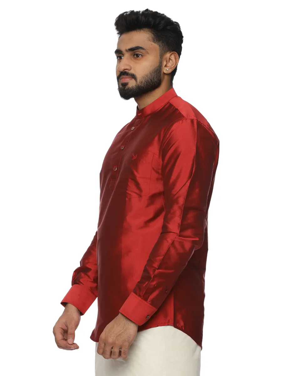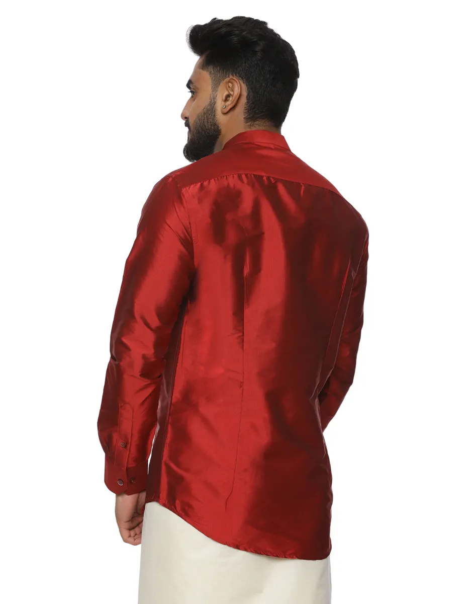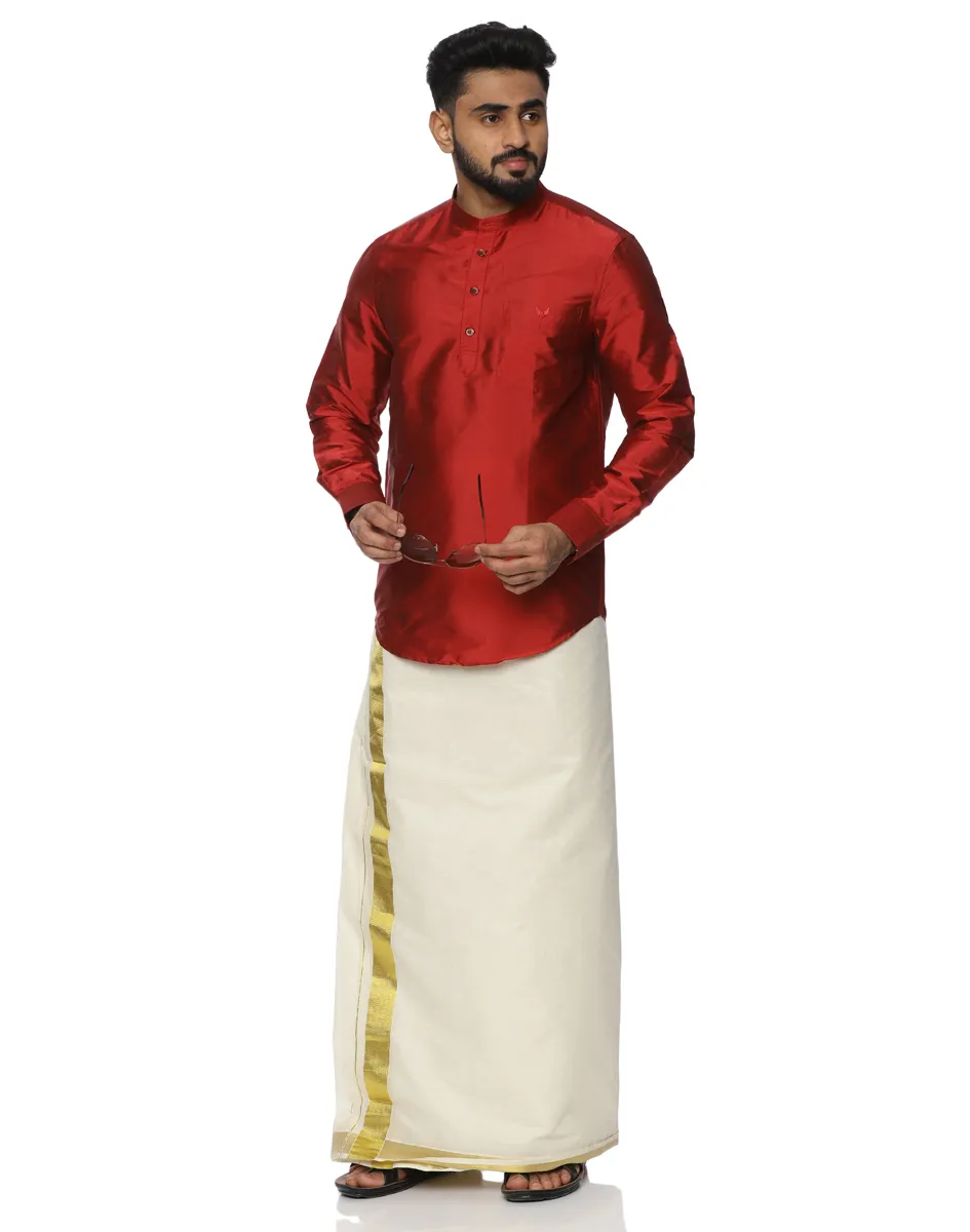 Pair the Warrior Scarlet Satin Kurta Shirt from House of Cocoon with an off-white or ivory dhoti or veshti for classic festive dressing, or style with tailored trousers for evening celebrations. Keep accessories minimal to allow the richness of the colour to take centre stage.