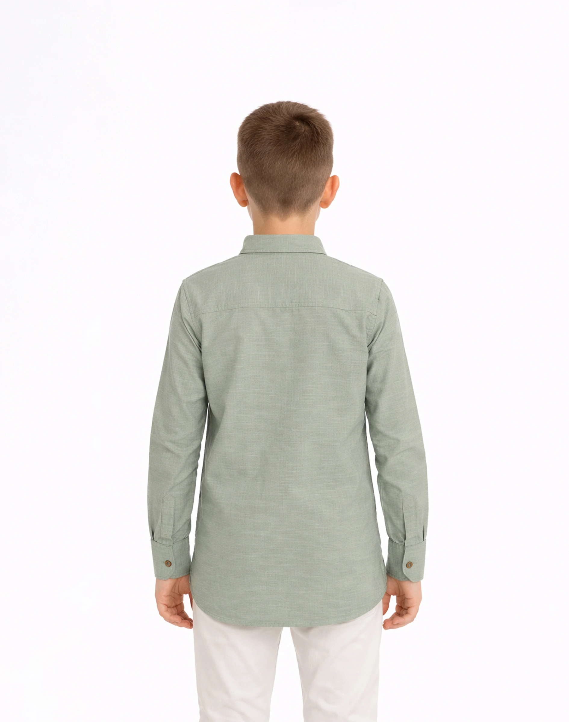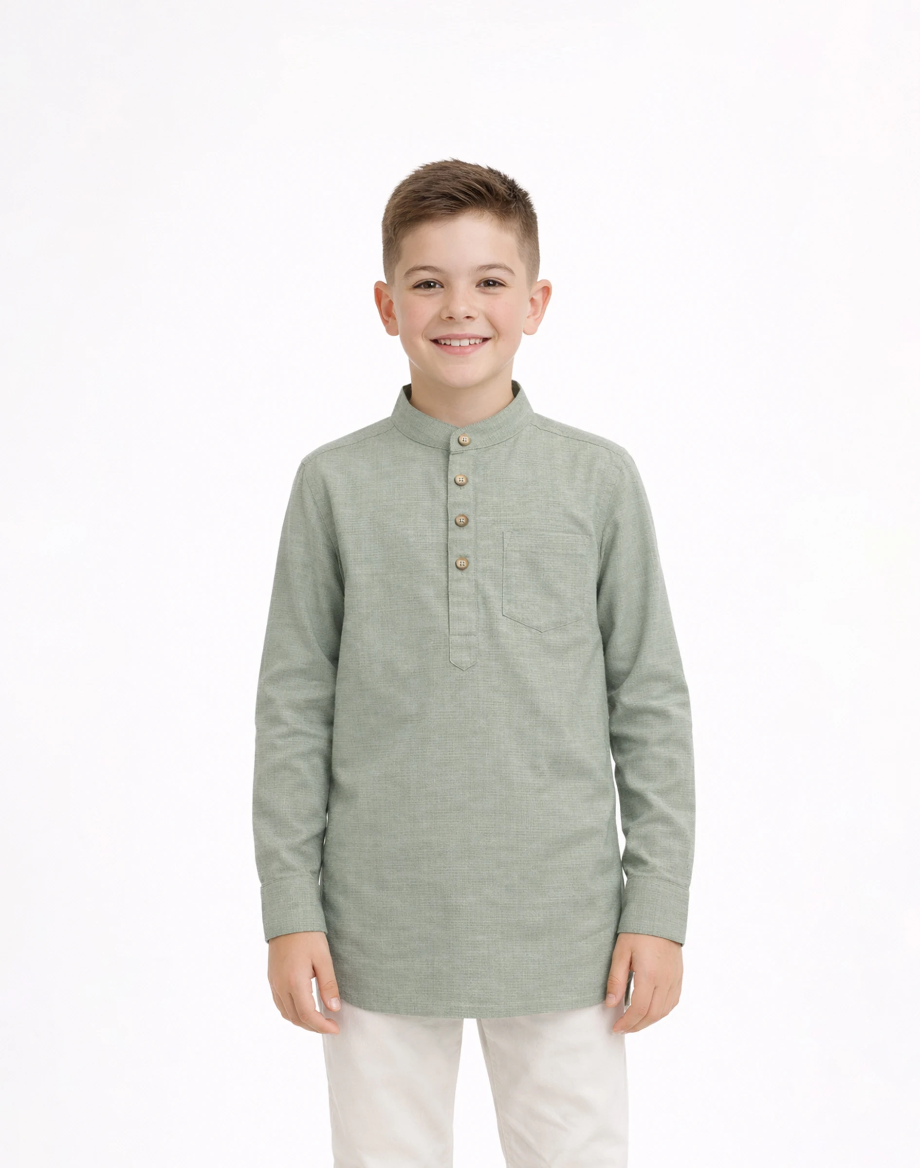 Refresh your child’s ethnic wardrobe with this soothing sage green textured cotton kurta. Designed with a finely woven texture, the fabric offers a natural matte finish that feels lightweight and breathable—ideal for long hours of wear during festive occasions or casual gatherings.The kurta features a classic mandarin collar, a neat front button placket with contrast buttons, and a straight-cut silhouette that ensures both comfort and style. The addition of a functional chest pocket adds a practical touch while maintaining a clean, minimal aesthetic.Its muted pastel tone makes it a versatile choice, blending traditional charm with a modern, understated look.