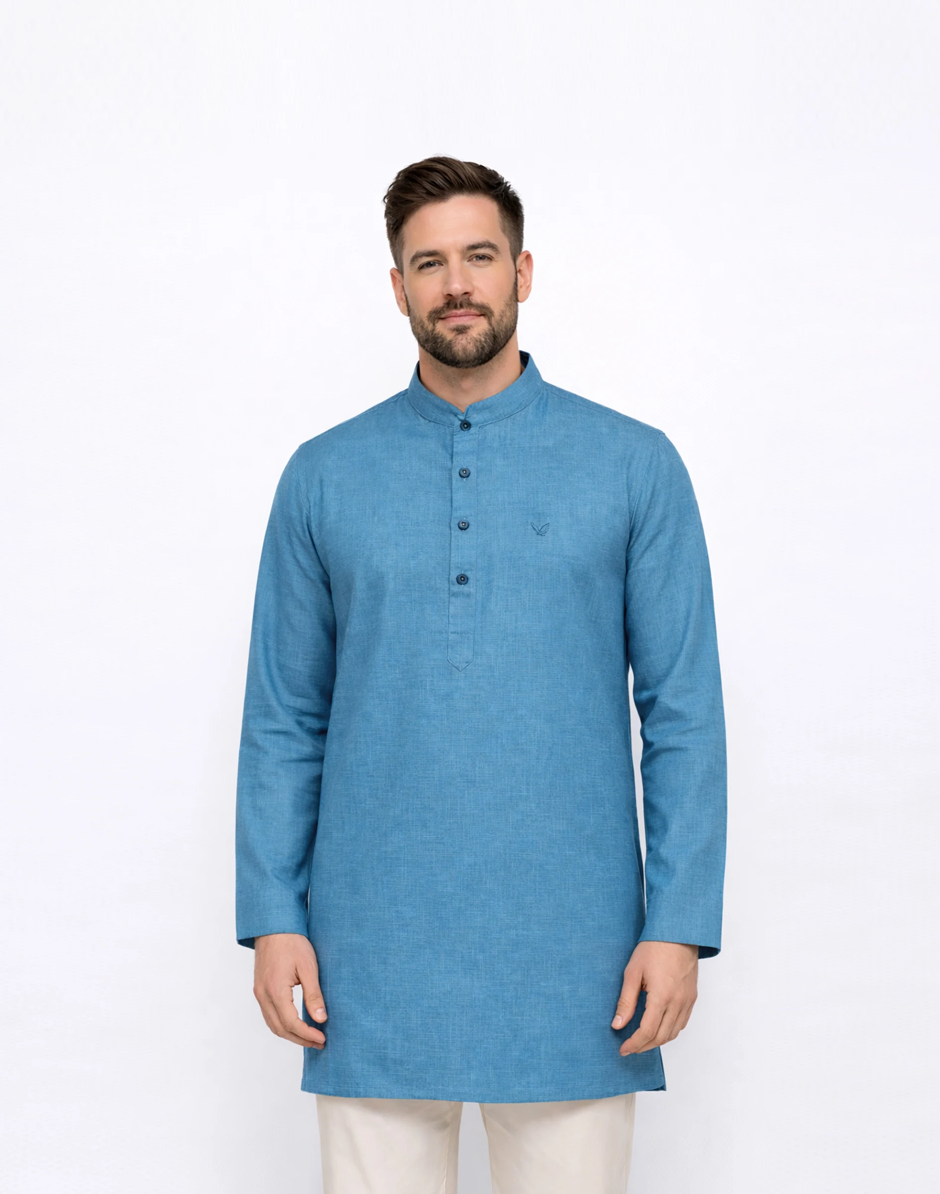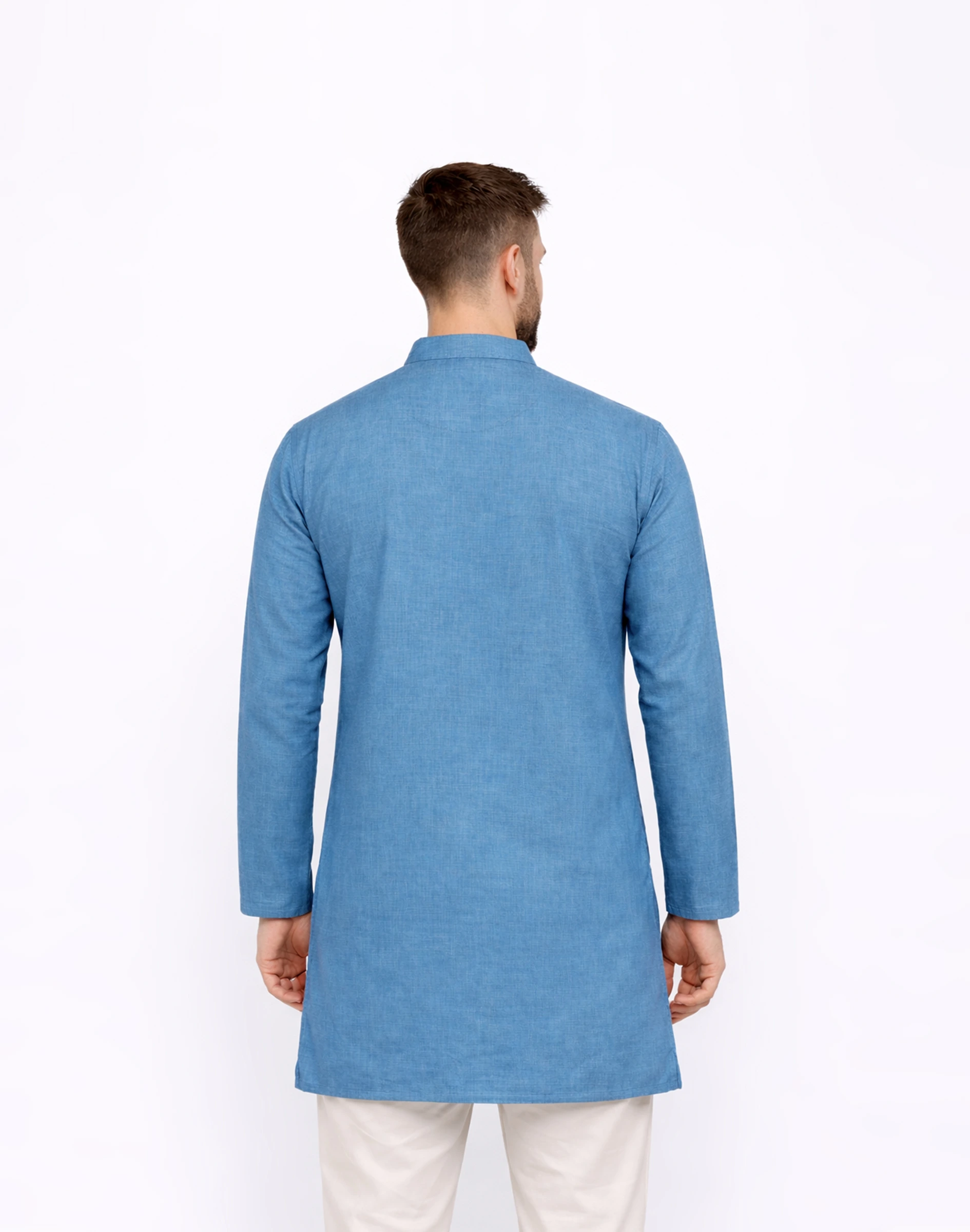 A serene sky blue kurta crafted from breathable cotton, featuring a clean mandarin collar and minimal detailing for an effortlessly elegant look.