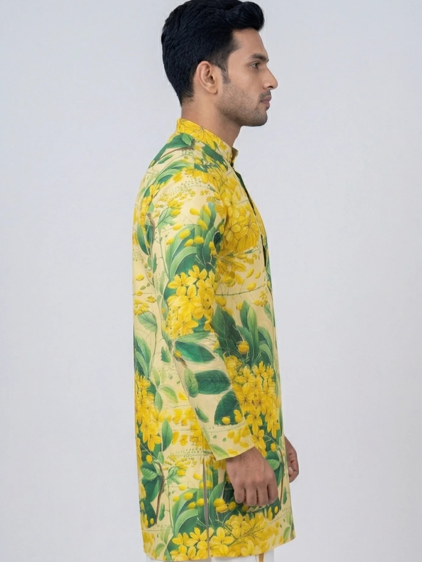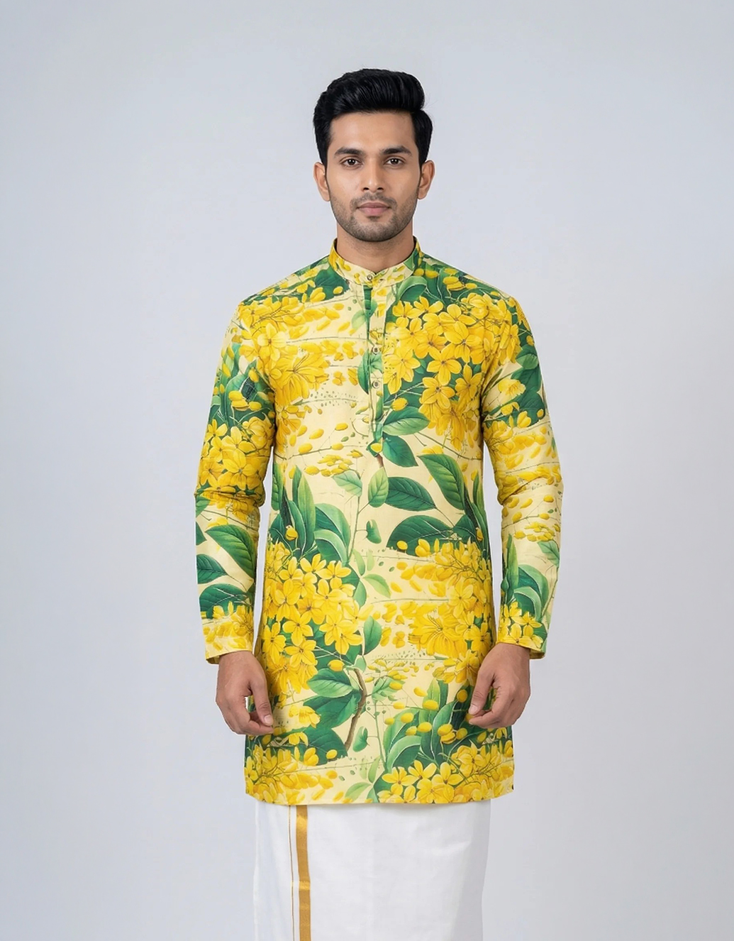 Inspired by the beauty of Kanikonna blooms, this vibrant floral kurta is crafted to bring festive elegance and traditional charm to your Vishu celebrations.