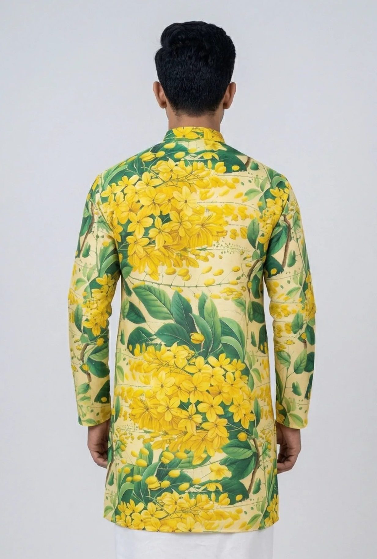 Step into the spirit of Vishu with the Warrior Vishu Special Kanikonna Festive Floral Kurta, a design that captures the essence of Kerala’s iconic golden blossoms. Featuring a rich yellow base adorned with lush green leaves and blooming Kanikonna florals, this kurta radiates positivity, prosperity, and festive energy. Tailored with a structured mandarin collar and a sleek front placket, the silhouette offers a perfect balance of sophistication and comfort. The intricate floral pattern is thoughtfully placed to create a visually striking yet elegant look, making it ideal for festive gatherings, temple visits, and special occasions. Pair it with a traditional white mundu with kasavu border to complete the authentic Kerala festive ensemble. This kurta is not just an outfit—it’s a celebration of culture, color, and tradition.